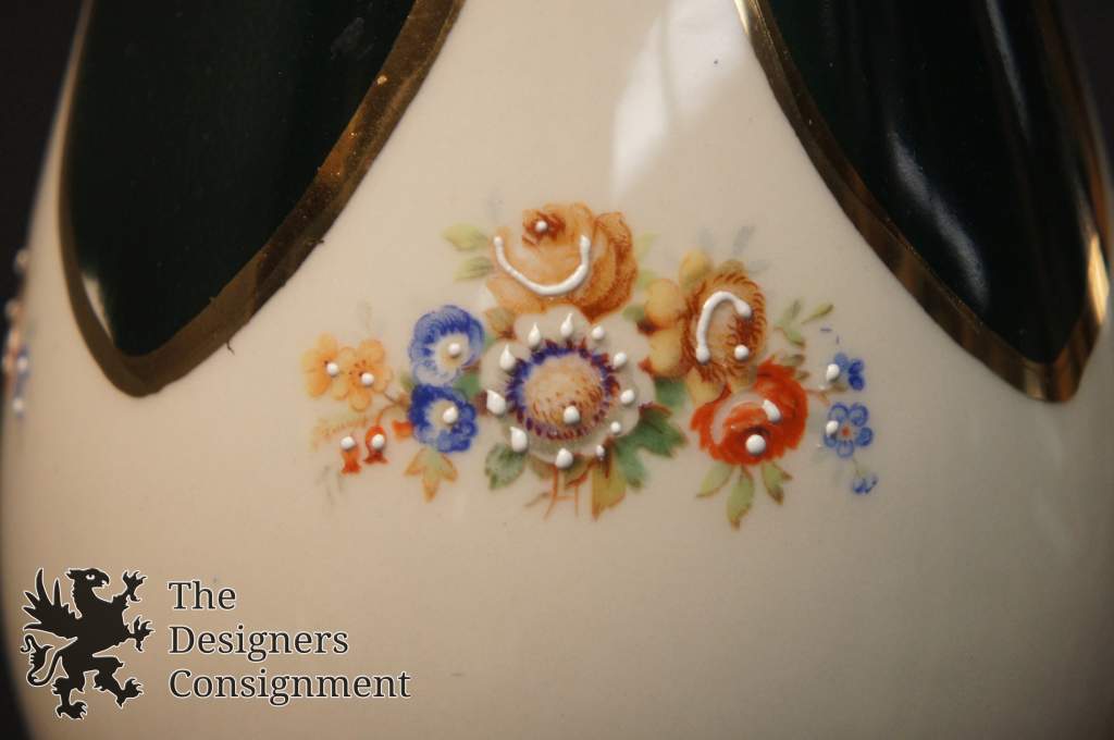 Amazing pair of Mid Century 35" Table Lamps. Green, White & Gold. Made from Porcelain with pierced brass base and upper light fixture. Light is covered by glass torchiere that holdsthe originalbell shaped shades. Rembrandt Masterpieces sticker along the top of the brass fixture. Hand painted flowers and accent trim. An absolutely gorgeous pair for any setting.