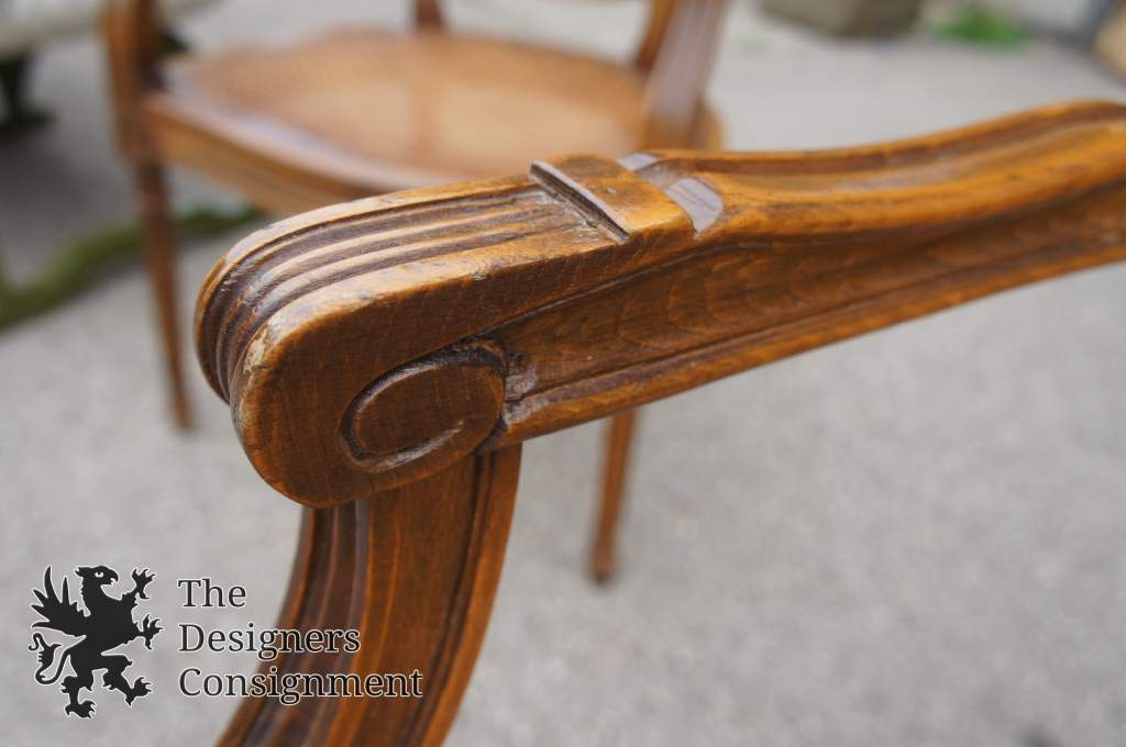 A lovely set of caned balloon back arm chairs with striped cushions. Made fromItalyin a FrenchCountrystyling. Each chair features a cane back and seat in addition to carved accents on the inside of each arm. Fronts of chairs are serpentine with a carved flower on the corner leading to fluted legs.