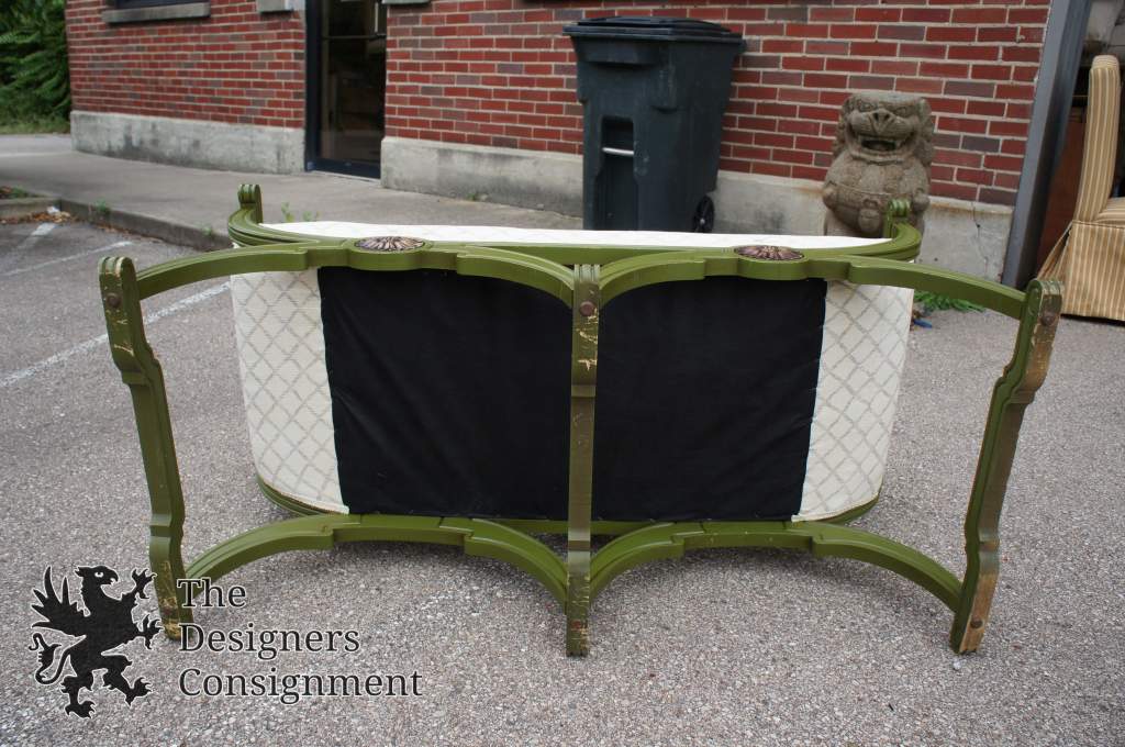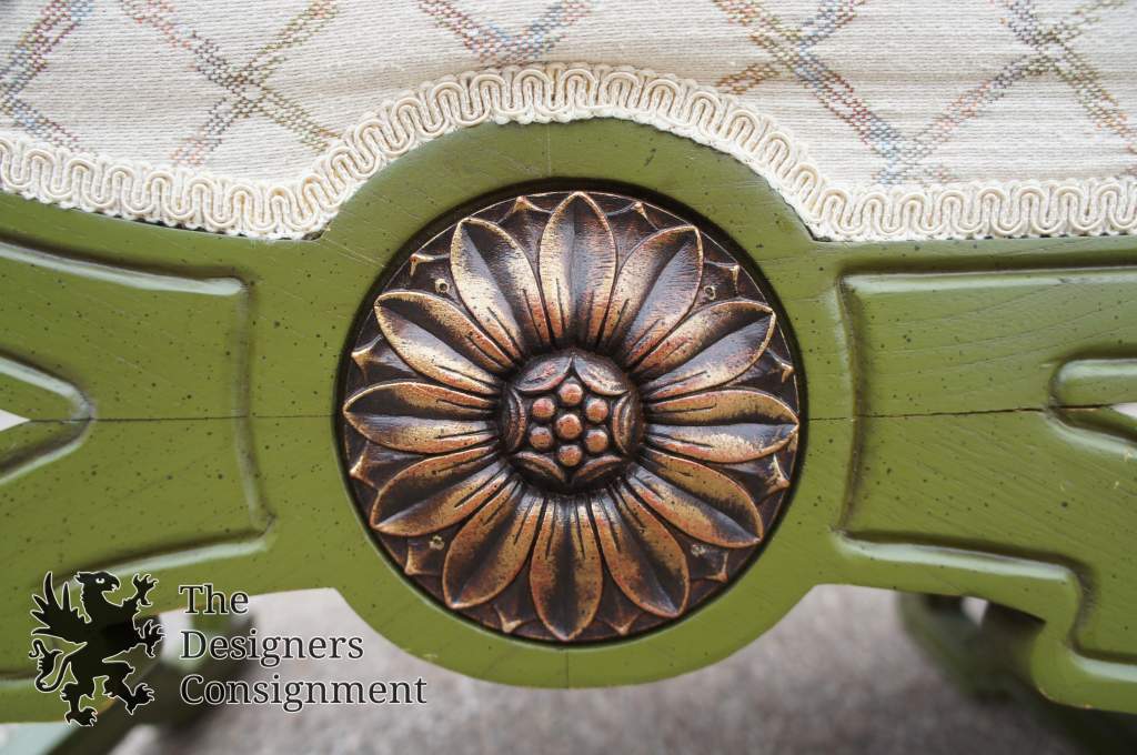 A gorgeous mix of French Renaissance & Traditional styling in this settee. Made from distressed oak. Finished in Green with a diamond striped upholstery. Arched legs and feet with finials along the back andupholsteredarms. Golden carved medallions ordain the front. A great addition to any home.