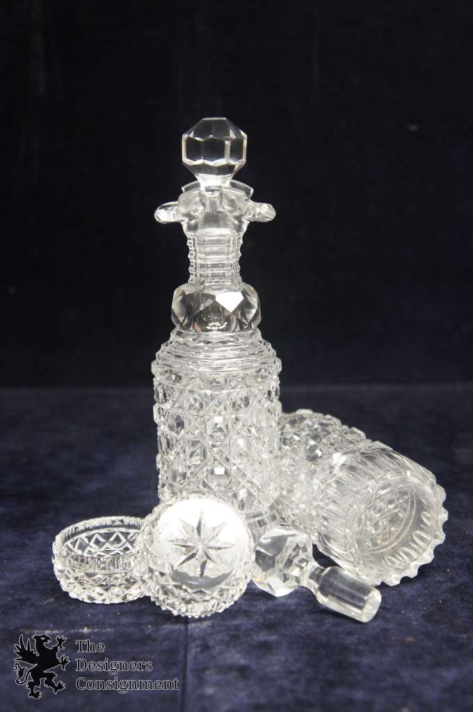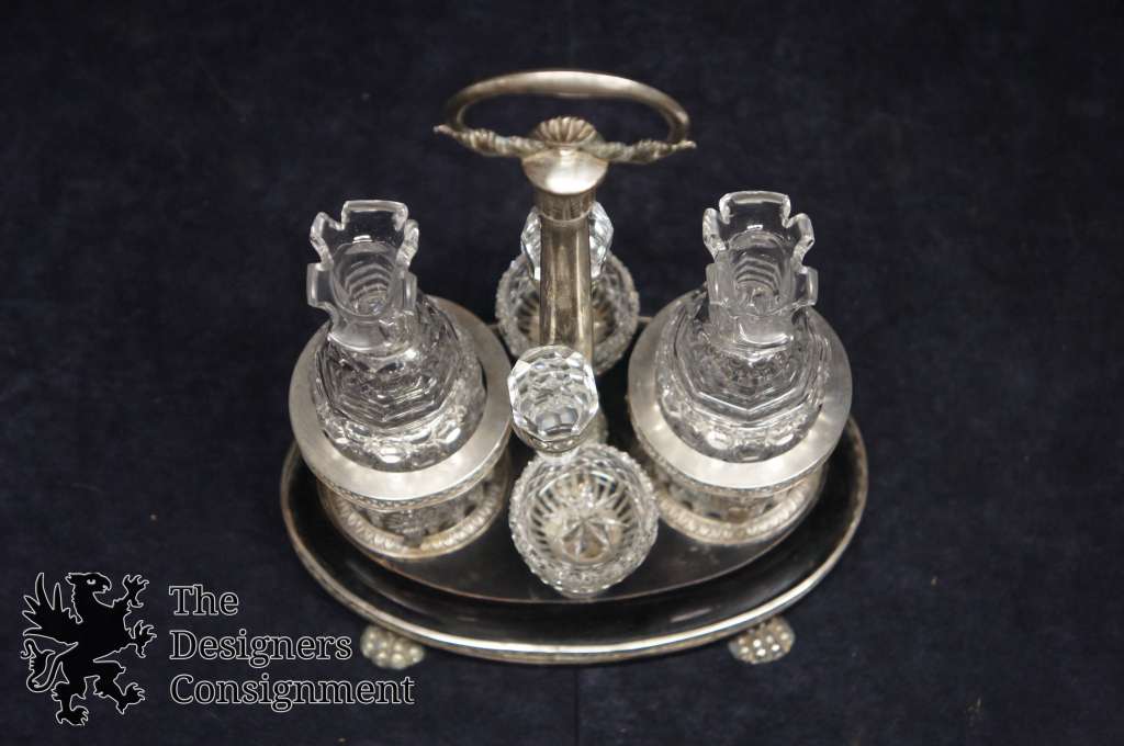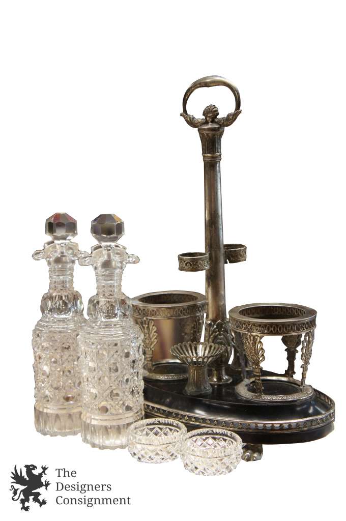 Vintage crystal cruet set with oil and vinegar bottles with stoppers and two salt cellars, intricate silver plated caddy with black base and claw foot legs.