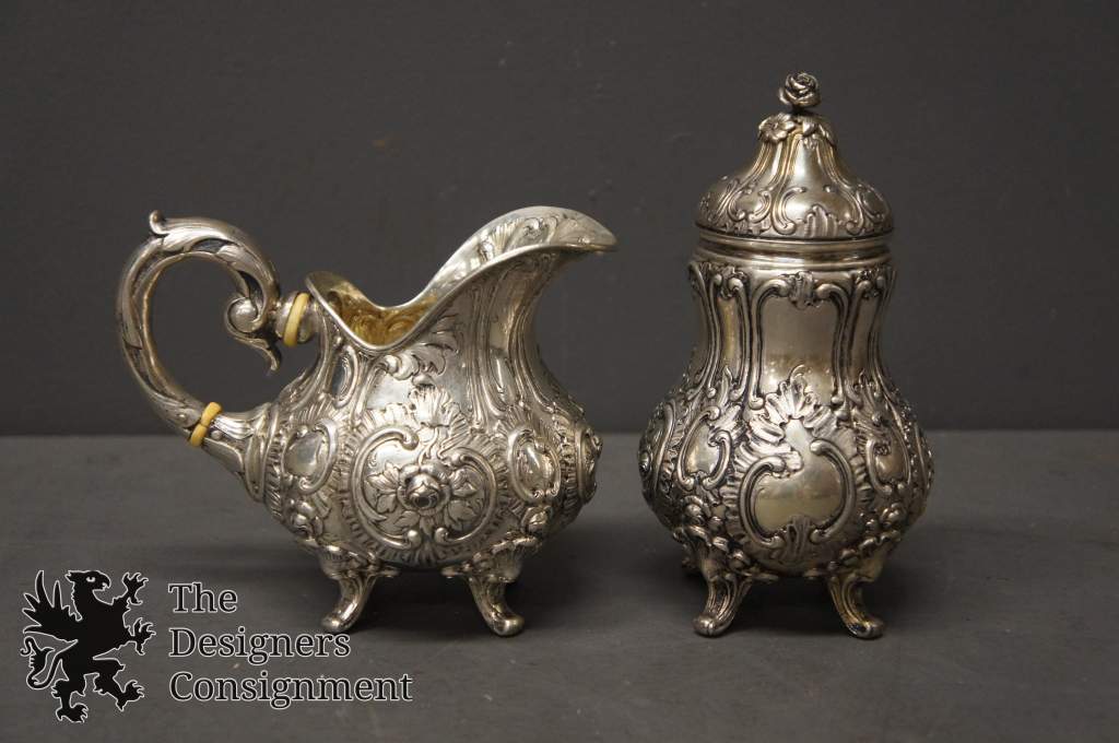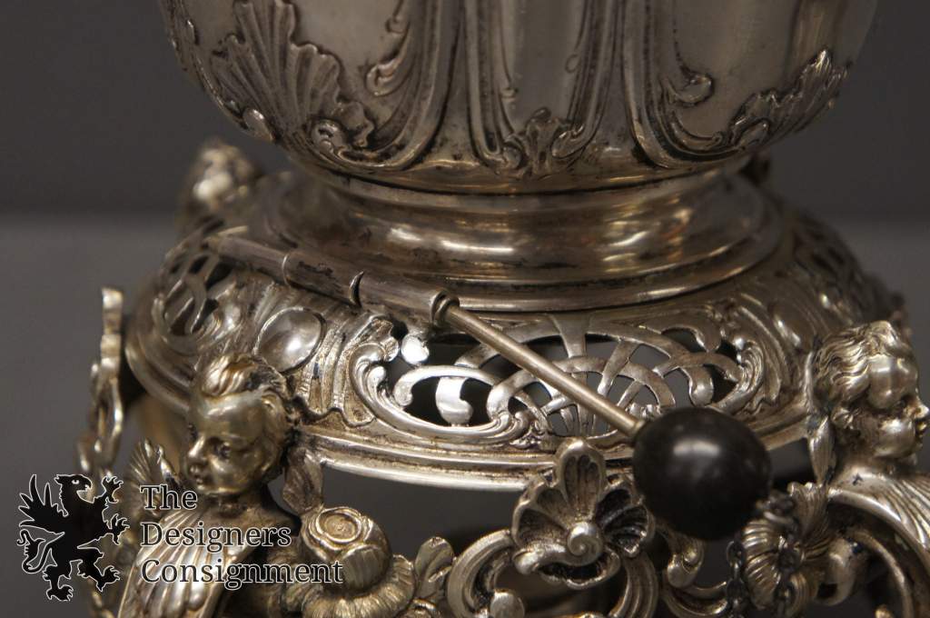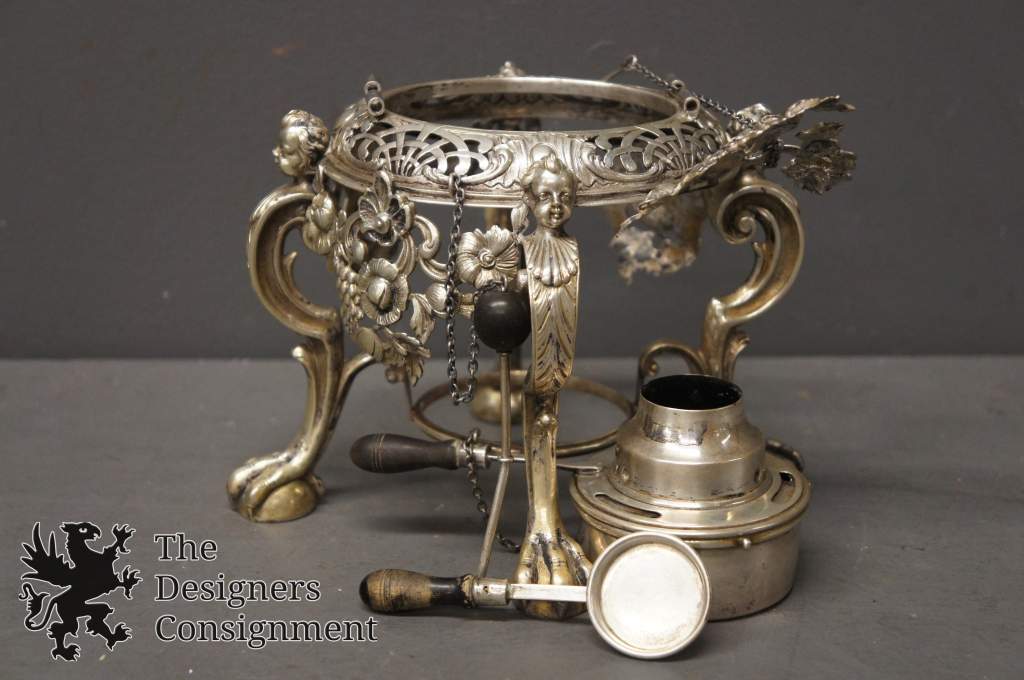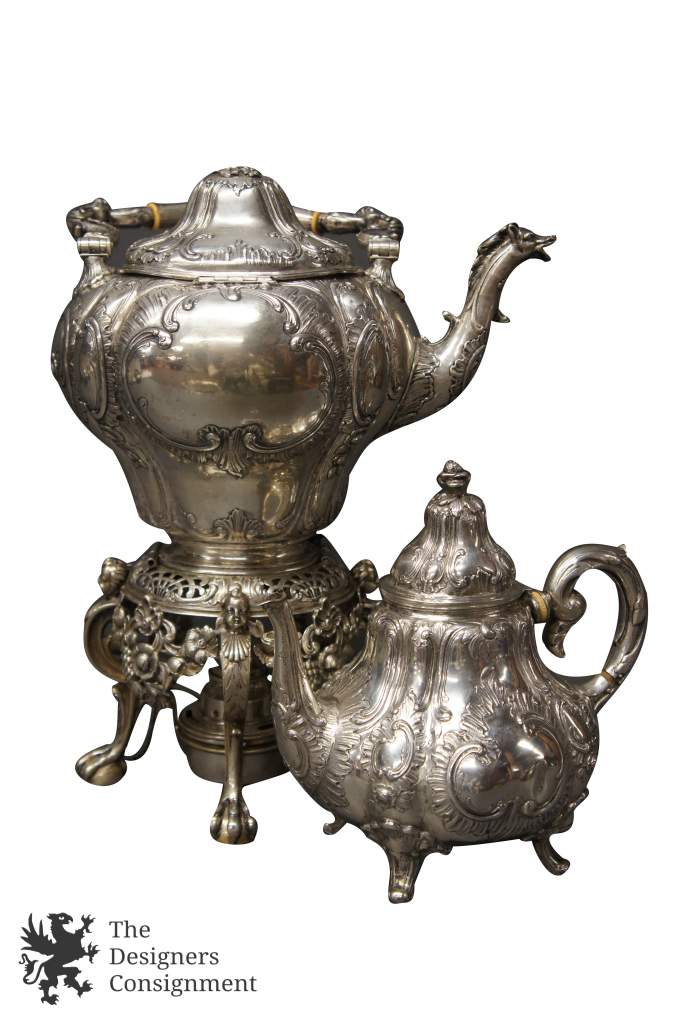 A wonderful 19th century tea set, Circa 1850-60s. Purchased in Denmark in 1953. High relief with gorgeous repousse. 8 Pieces, including a magnificent burner with figural cherubs with paw feet around the burner.