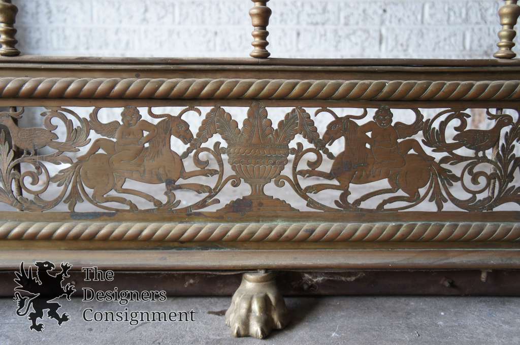 One of a kind cast brass fireplace holder from the Hearst Castle. Circa 1850-1870s. Features an embossed U shape with a filigree panel along the center. At the midline is an urn flanked by mythological horned horse like creatures being ridden by cherubs/ angels. Continued throughout is floral trim, birds, and winged creatures. The piece sits upon claw feet and is ordained with 10 finials along the top. Amazing craftsmanshipand detail.