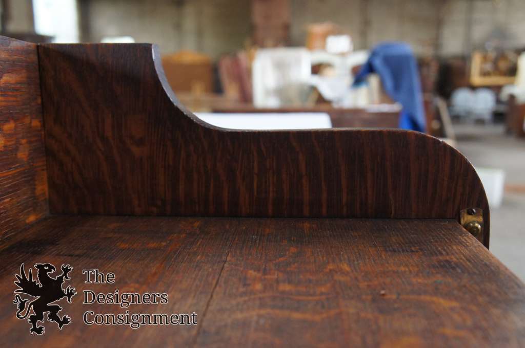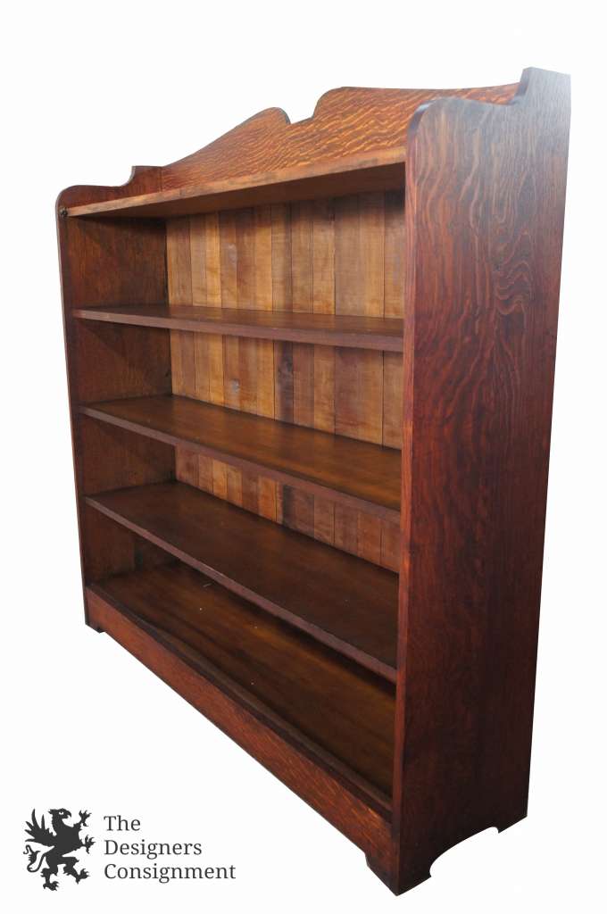 A beautiful Mission style Oak bookcase with paneled backing. Features 5 shelves with a serpentine back. Circa 1950s.