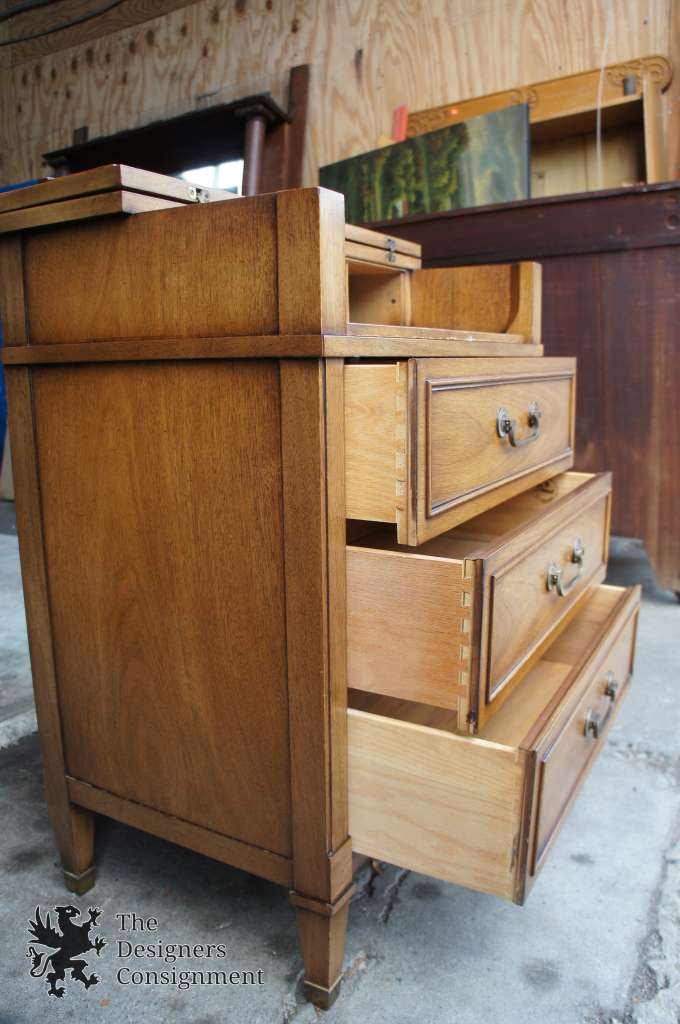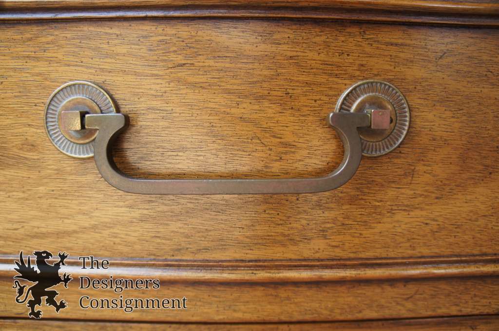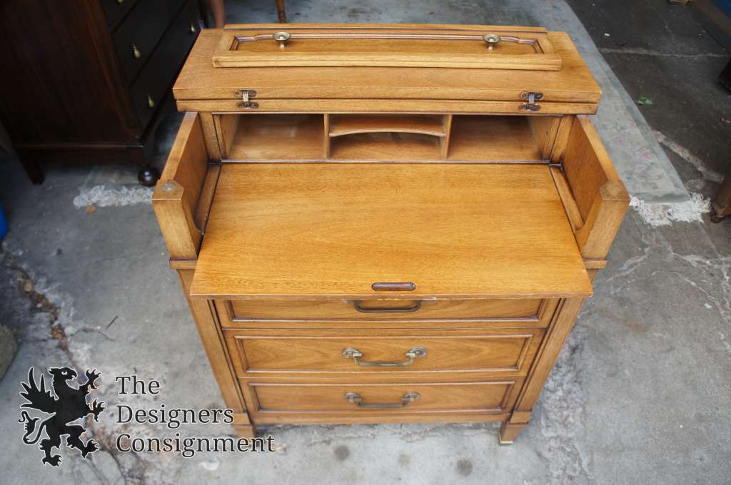 A quaint flip top secretary desk by Drexel. Circa 1961. Made from a distressed Oak in traditional styling. Features a pull out surface for writing, four pigeon holes along the back in addition to the three drawers for storage. The perfect compliment to any space.