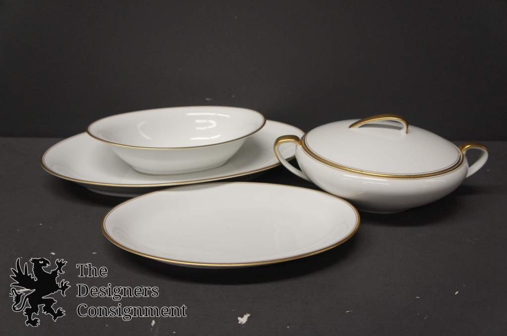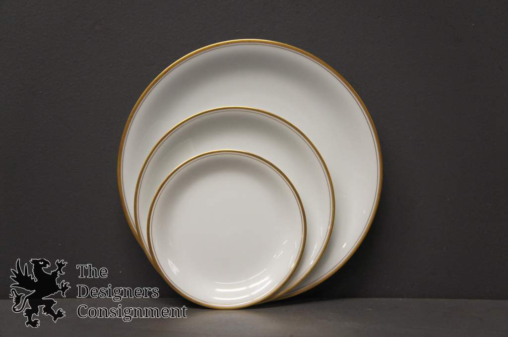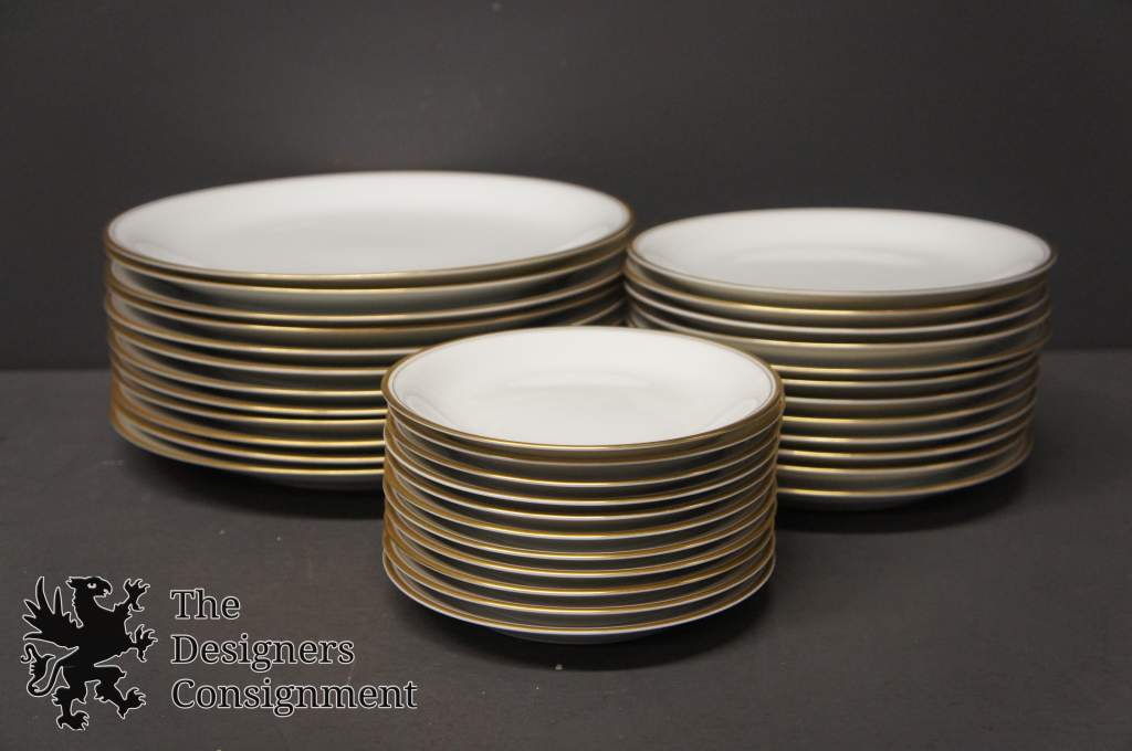 90 Piece dinner setting in "Bradford pattern" Pure whitebase with gold rim.