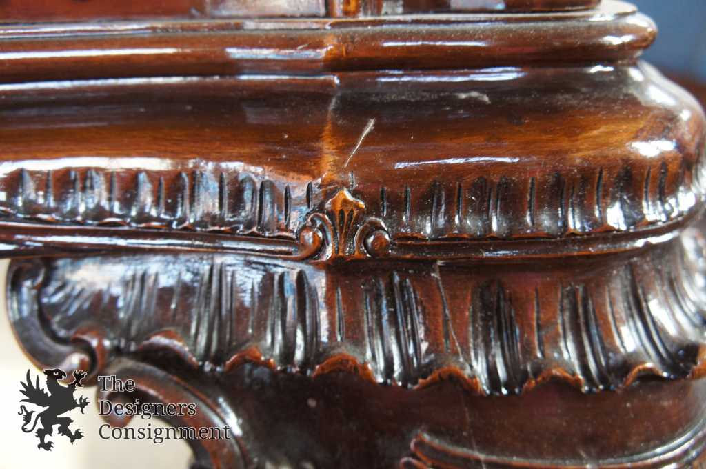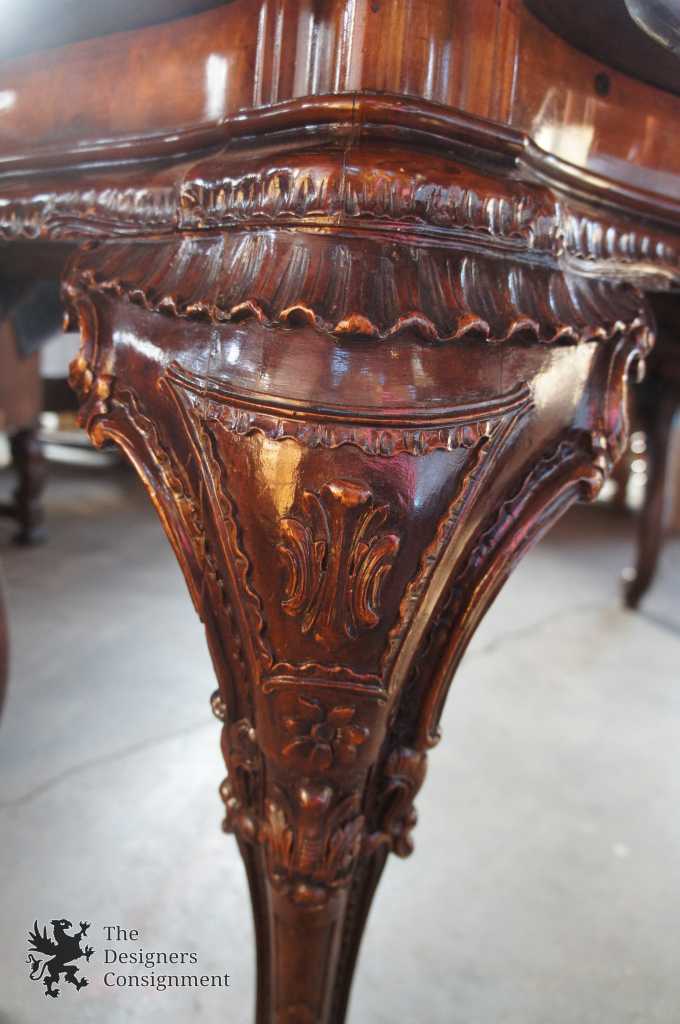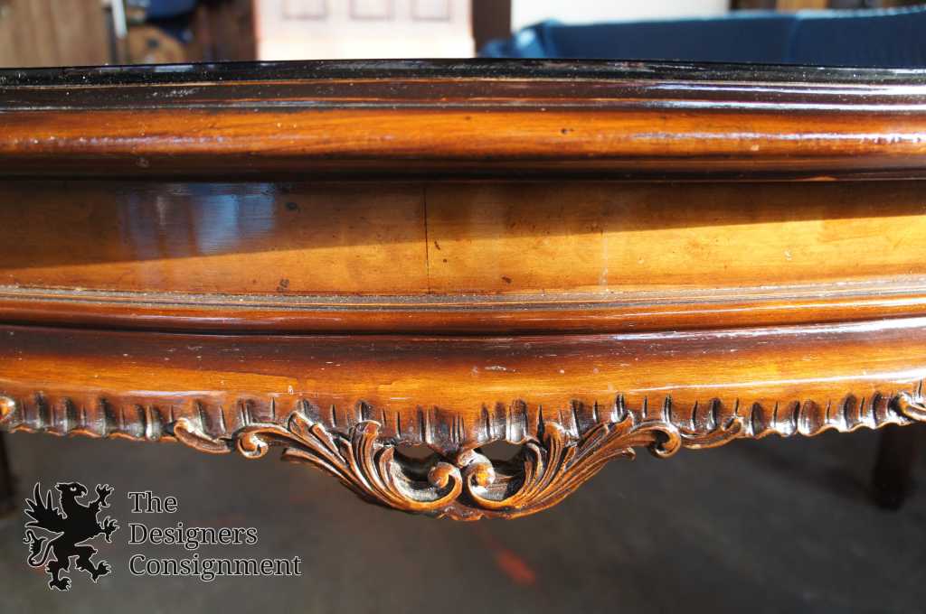 A gorgeous serpentine dining table or desk. Made from Mahogany with an inlaid smoked (black) glass top. The table is heavily carved with cabriole legs and scalloped accents.