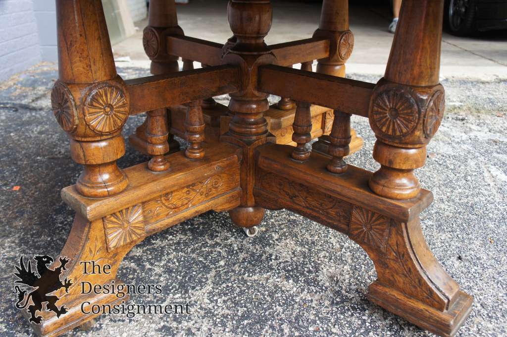 A stunning Victorian Eastlake dining table. Made from Quartersawn Oak with meticulously carved detail. Features a floral pattern boarding the apron, hand turned legs and sunburst medallions. Each side of the base has 3 casters. Table does not have any leafs, but we could have some made for an addition cost.