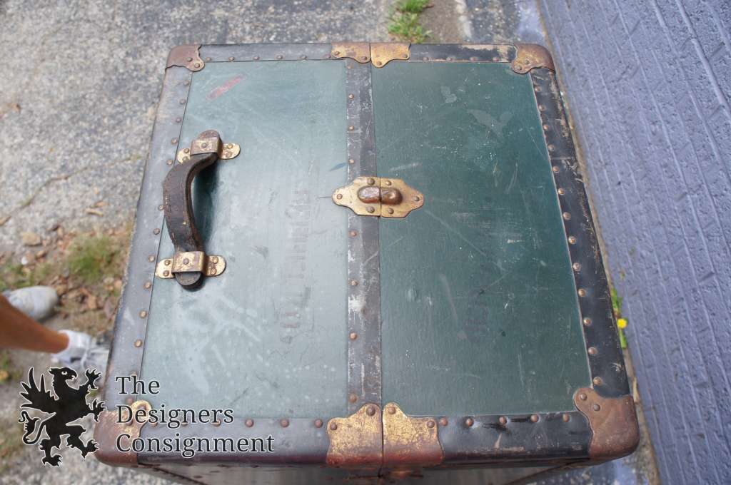 Taylor Fibre co Vulcanized Steamer Trunk. Green exteriorwith interior. Features drawer and hangers for storage.