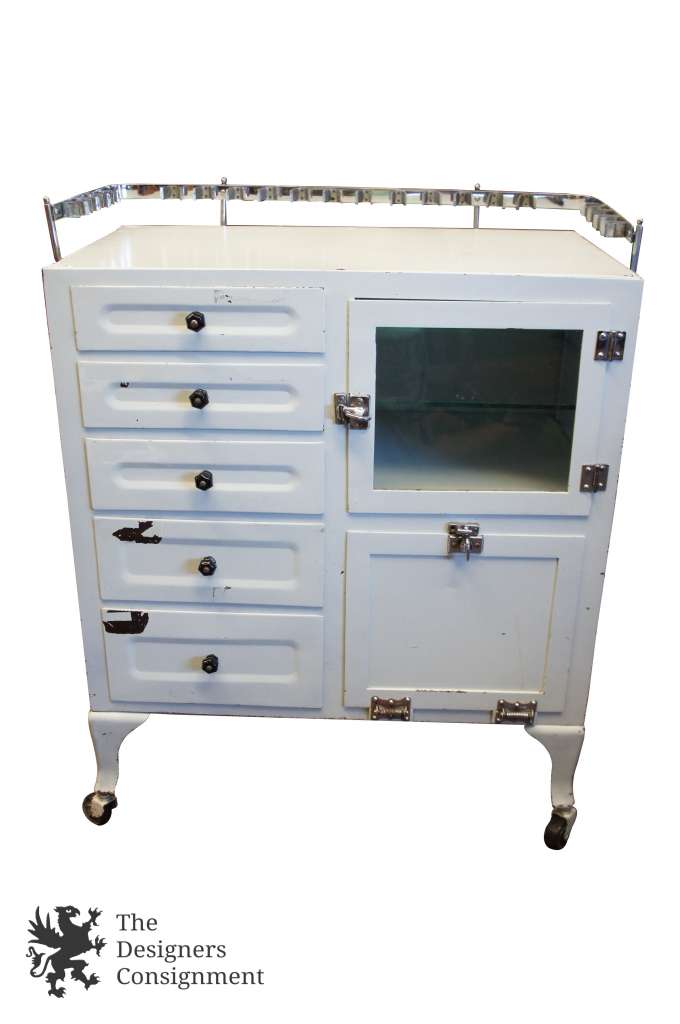 1940s industrial cabinet. Originally came from an Opticians office. Made from medal with a white finish and chrome accents. Along the right is a glass door with adjustable shelf and hatch below. The chrome bar along the top was meant to hold instruments.