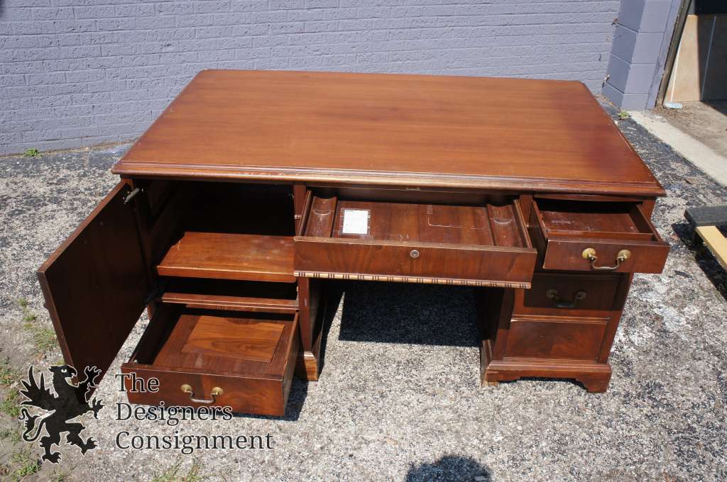 Vintage Solid Mahogany Desk Office Carved Accent Six Drawers Cabinet Brass Pulls (local pickup)