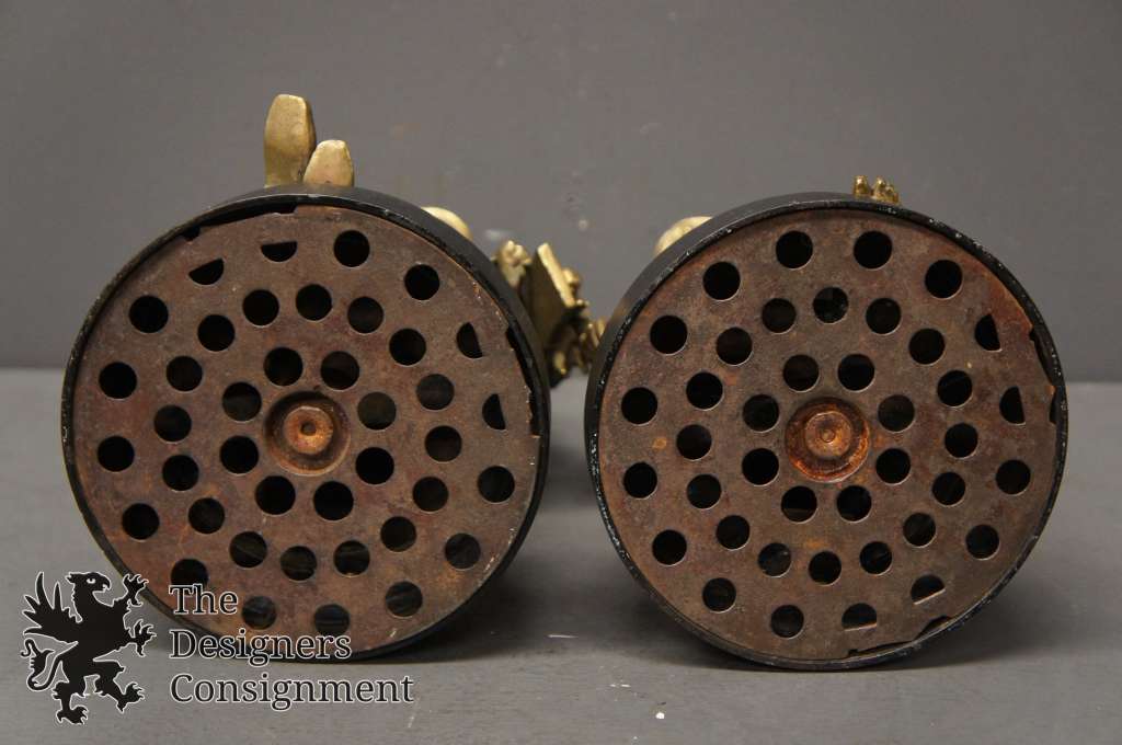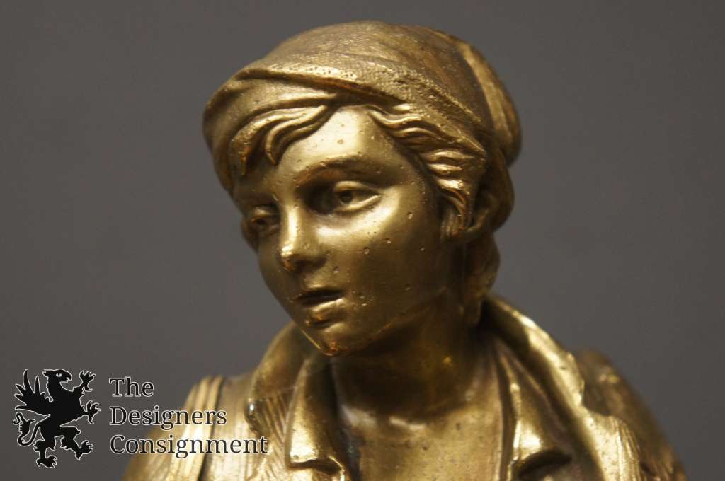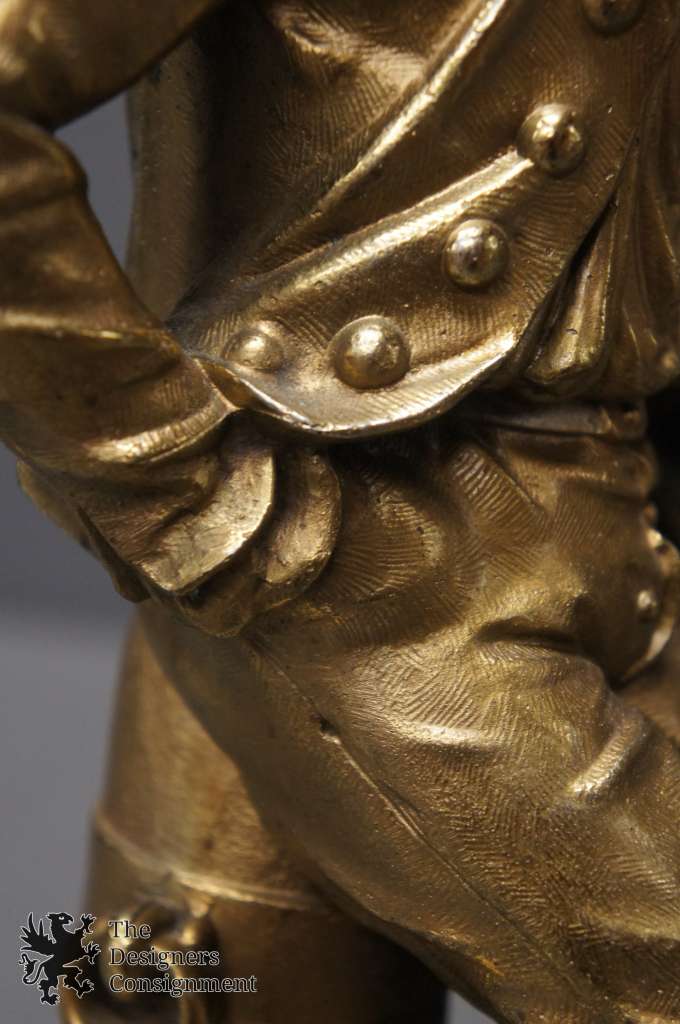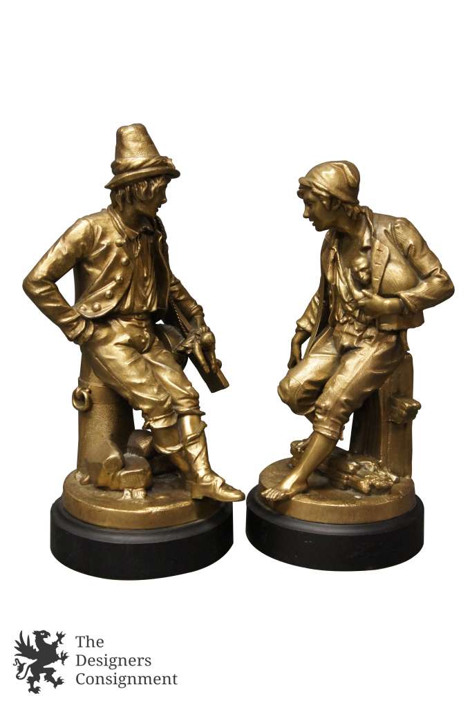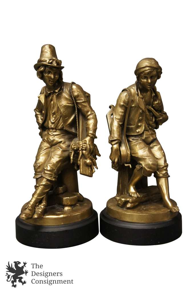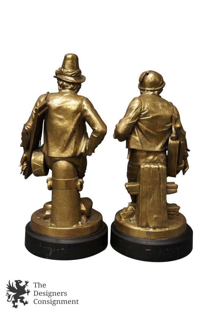 Unique pair of cast bronze figures. Featured are a pair of musicians in colonial attire. One can be seen with a monkey stuffed into his jacket. The other holding astuffedanimal. Both carrying instruments. A great addition to any setting.