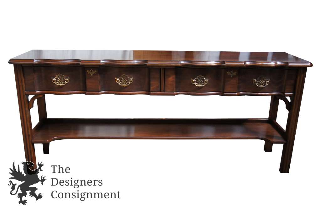 The perfect console table for any space. A classic take onChippendalestyling by Harden. This beautiful sofa table is made from cherry with a serpentine front and lower tier or shelf.