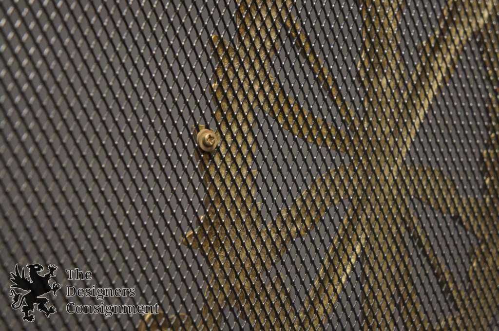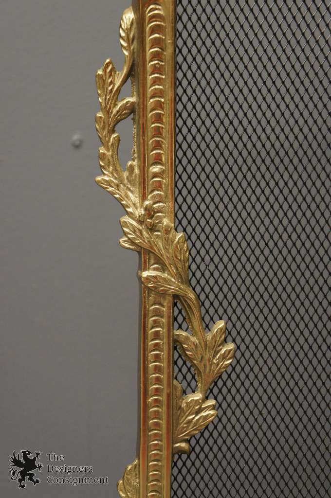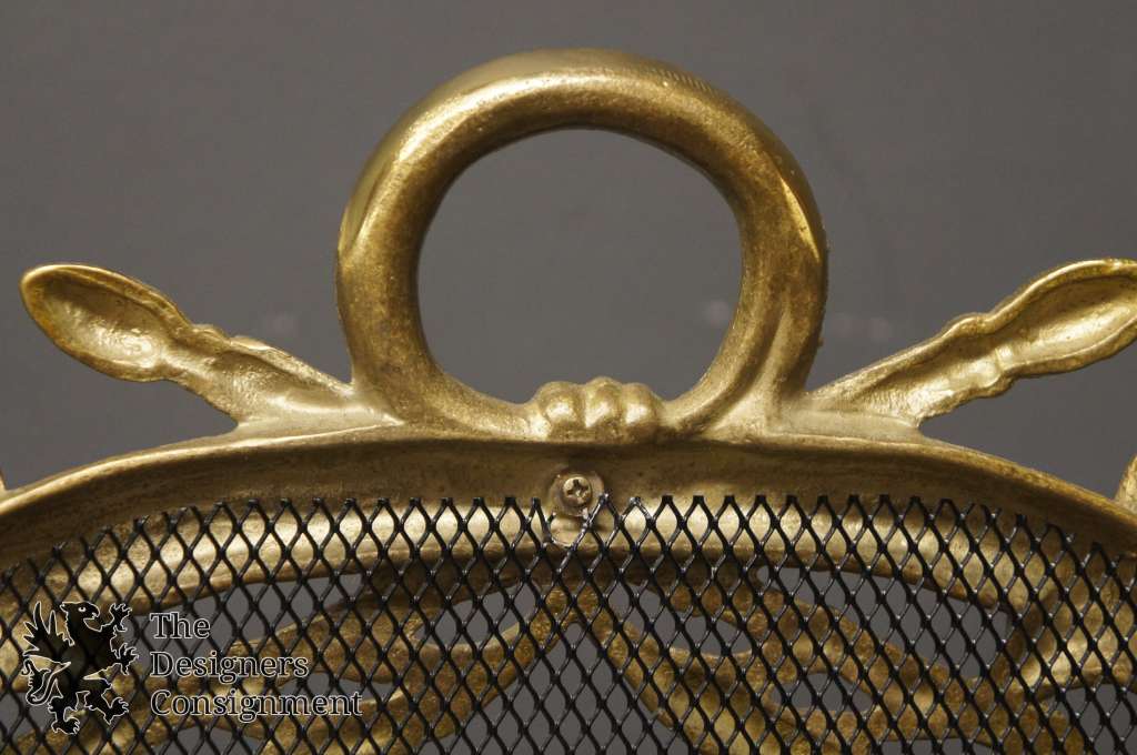 Louis XV Style Gilt Brass Fireplace Screen. Features a mesh insert allowing you to see the fire behind. At the center is a Torch and bow surrounded by laurel leaves. Frame is vibrant and ornate with French styling throughout. A fantastic addition to any setting.