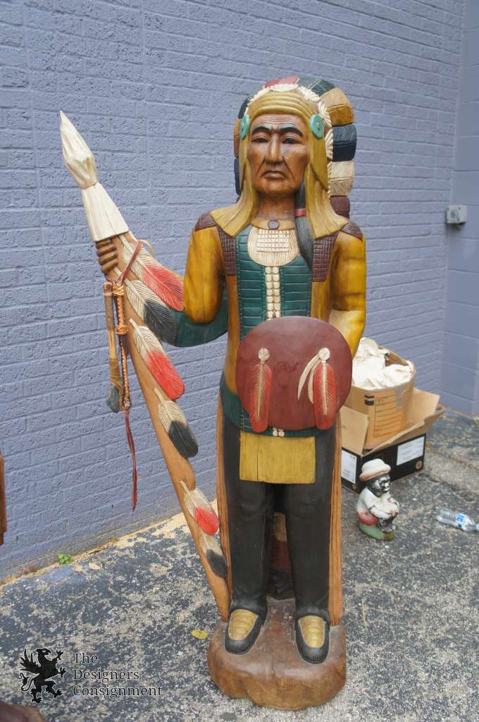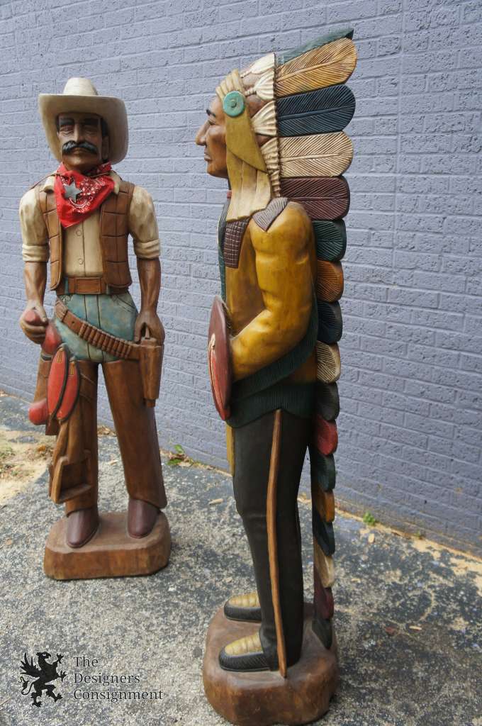 Here we have 2 life sized wood carvings. Featured are a Cowboy and Indian (chief). Each piece is Meticulously detailed and painted. The cowboy can be seen with his hand on hispistolin holster. He has a lavish blackmustacheand large cowboy hat. Wearing abandannaaroundhis neck with Arizona Rangers metal badge.