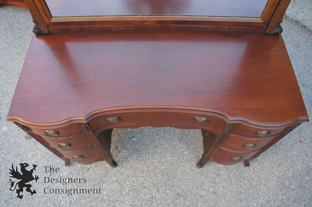 The perfect dressing table. Made from Mahogany with a serpentine front and 7 drawers. Features carved accents and a fluted frame. Mirror is scalloped with a beautiful grain.