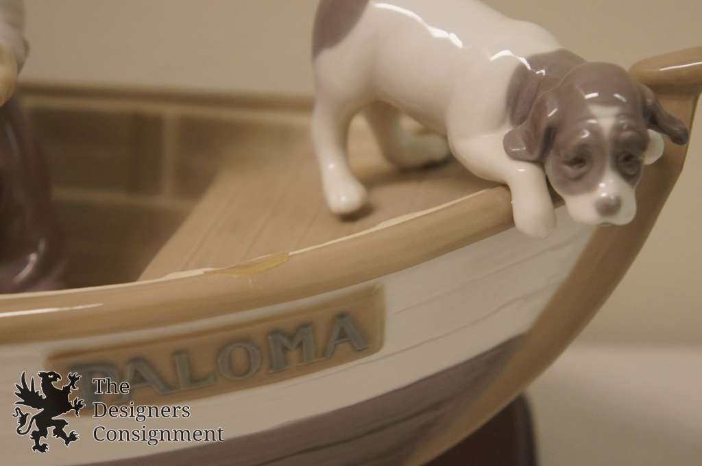 Gently Used - Chipped Pinky on Boy; Fishing Rod Broken; Oars Unattached/Glue Residue on Boat; Scratches on Wood Base