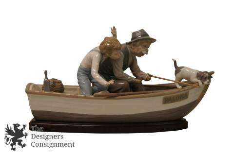 Vintage Lladro Spain #5215 "Fishing with Gramps" Figurine 16" W/ Wooden Stand