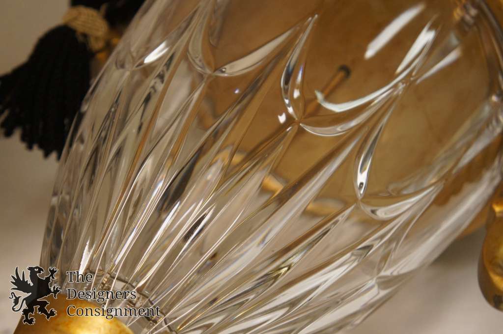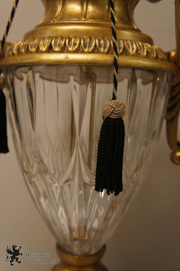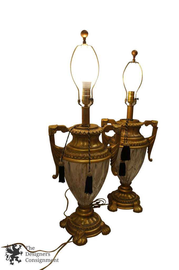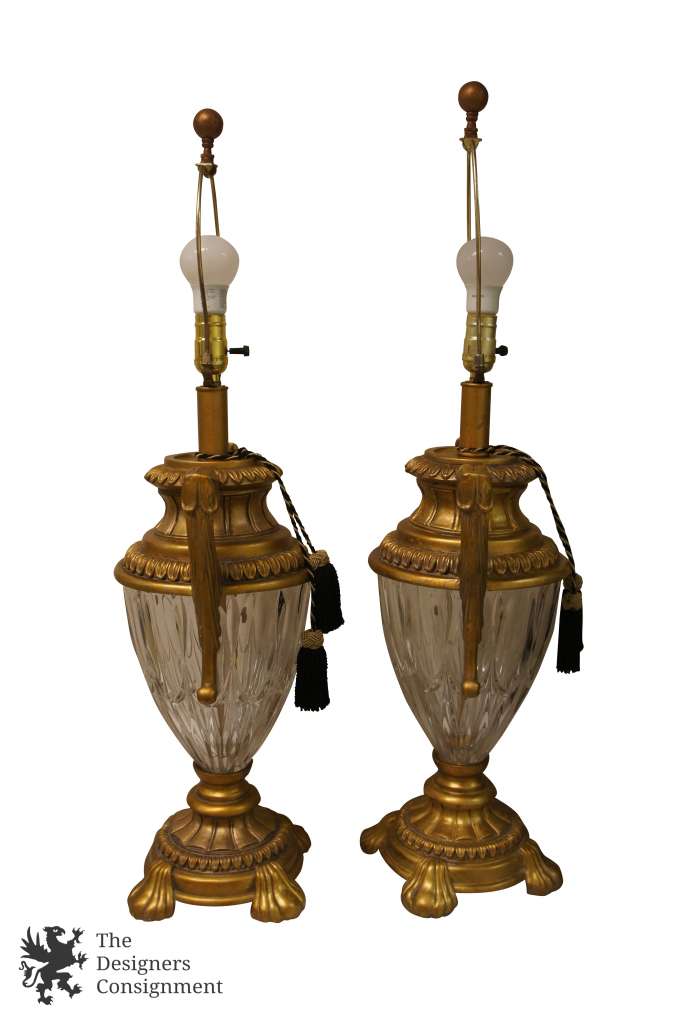 A lovely pair of Regency style lamps. Gold painted composition with crystal center and tasseled accent. A great addition to any setting.