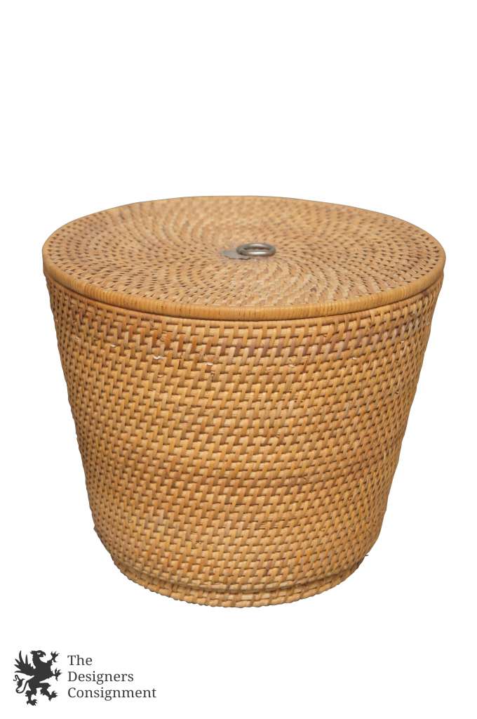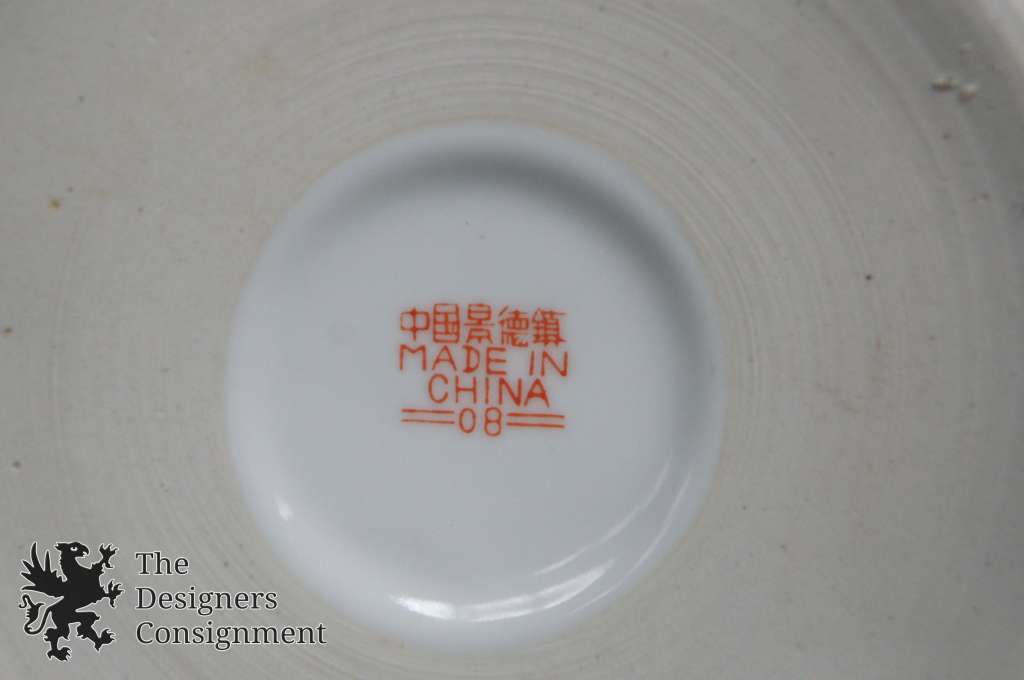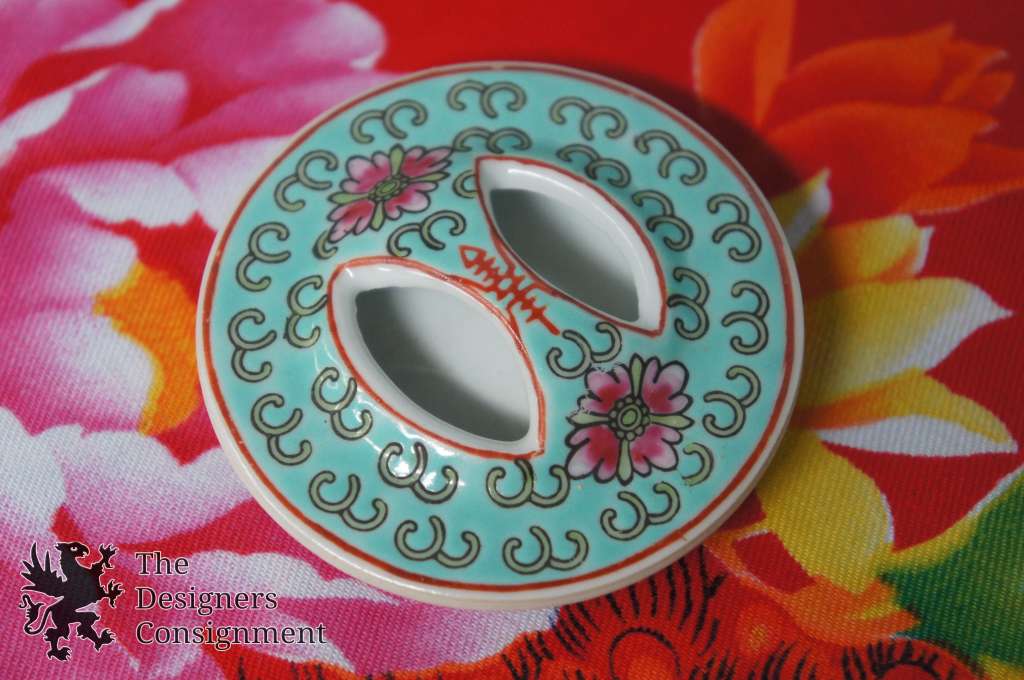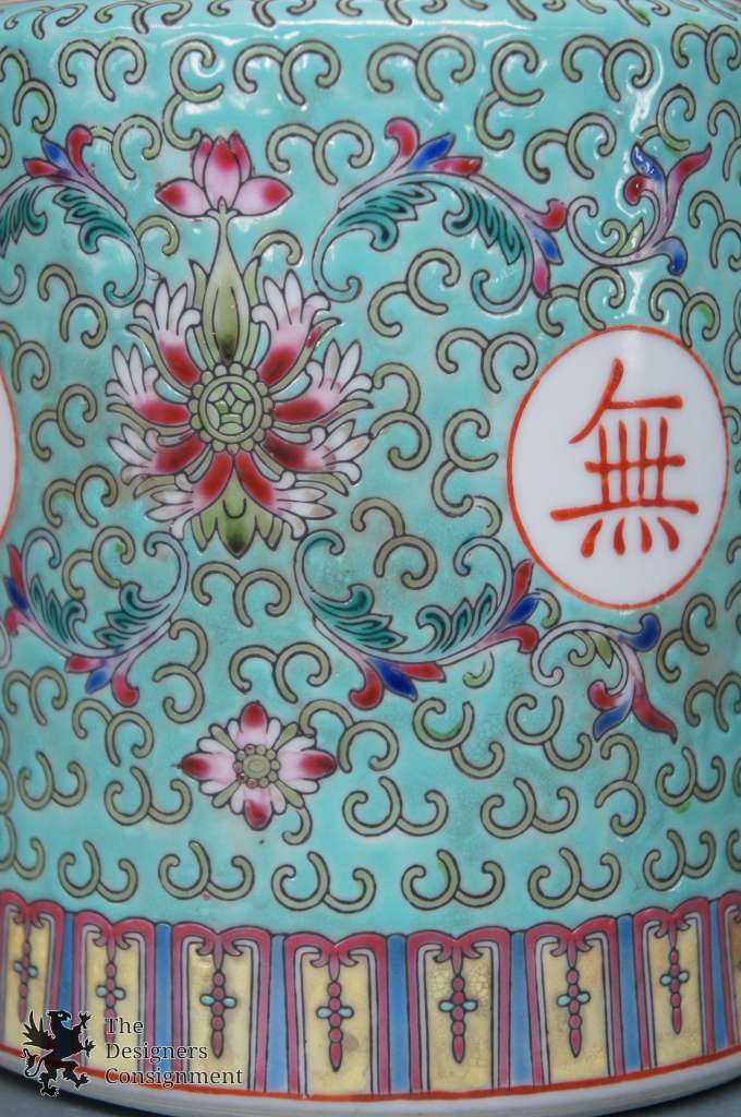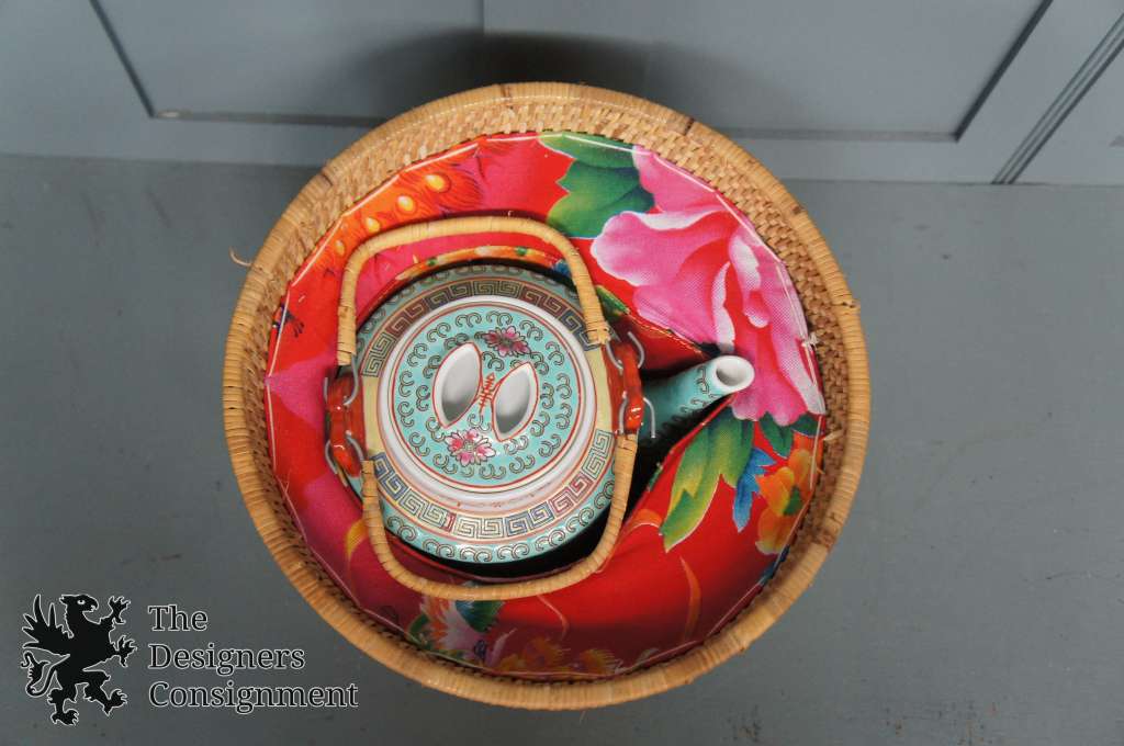Chinese Famille tea pitcher with textured design. Lidded with woven handles. Complete with custom fit basket for traveling and storage.