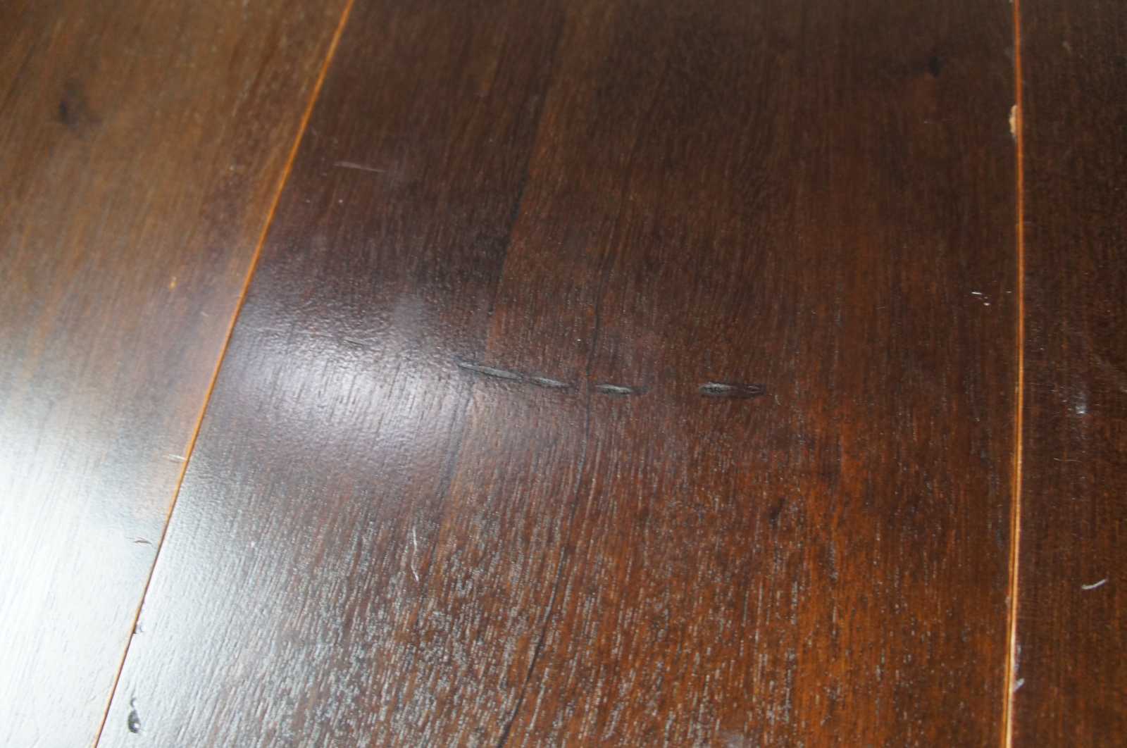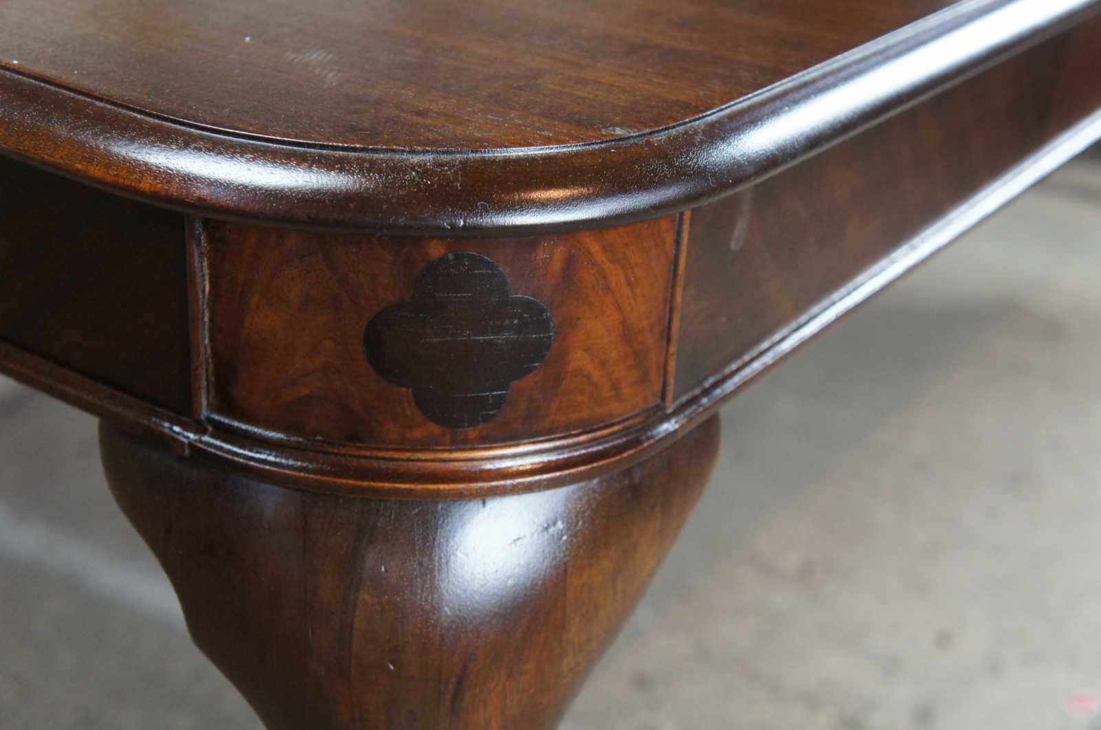 Queen Anne style with swooping cabriole legs. Made from Mahogany, featuring flamed corners showing marquetry inlay clover leaves. Features 2 table leaves for extension and removable legs.