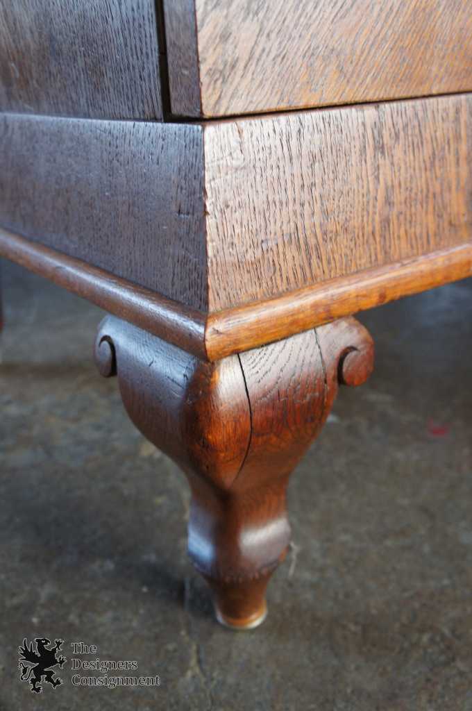 Intriguing Art Deco Server with glass front hutch for display. Made from Oak with parquetry design and carved accents. The lower portion opens to reveal two drawers and a shelf. Each drawer is dovetailed, and accented with neoclassical hardware. The right drawer is lockable. Hutch features split beveled glass doors and shelf for display. A beautiful overall design that will make a great addition to any collection.