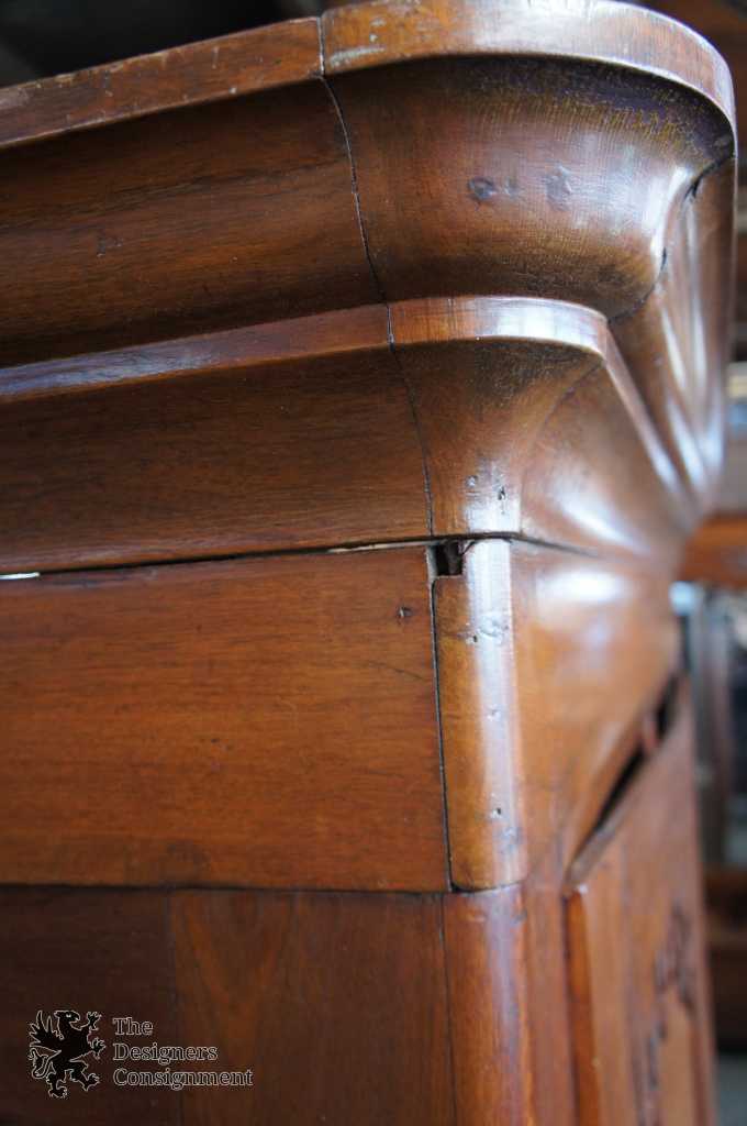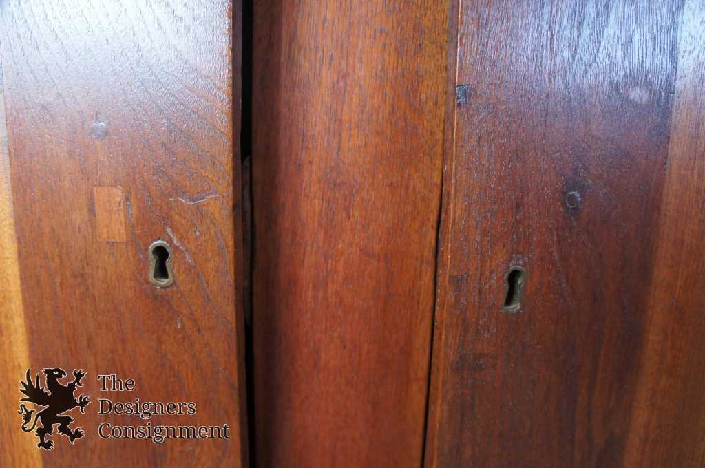 General Use Related Wear - Past Repairs; Slight flex; Missing Piece of Carving on Door (happy to have repaired); Distressing & staining along the lower and left side.; No Key