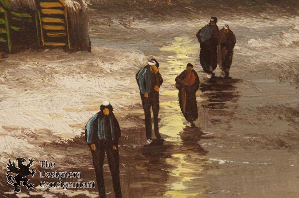 Dutch ladscape painting signed Verheul. The artist Verheul does not have an extensive extensive record, but lived between 1897-1971. This realist piece shows a village after snowfall in the evening. People are seen walking the streets as the moon illuminates the area. Signed and framed. A great addition to any collection.