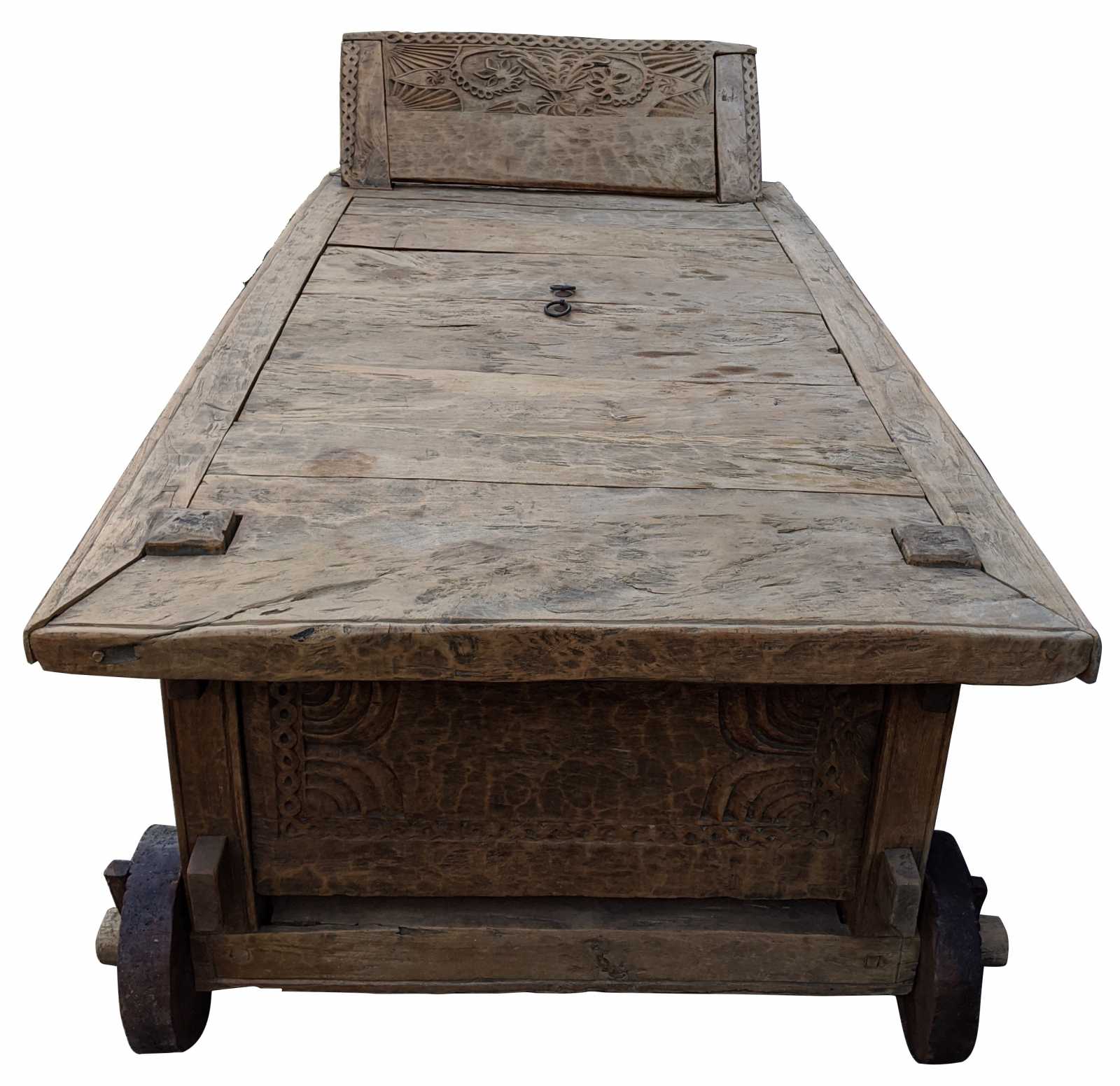 This beautiful example comes from Bali, Indonesia. It was purchased in the 1970s and includes intricately carved details. The piece is on wheels for ease of movement, and even includes a head rest which is not very common on these pieces. The head rest is removable.