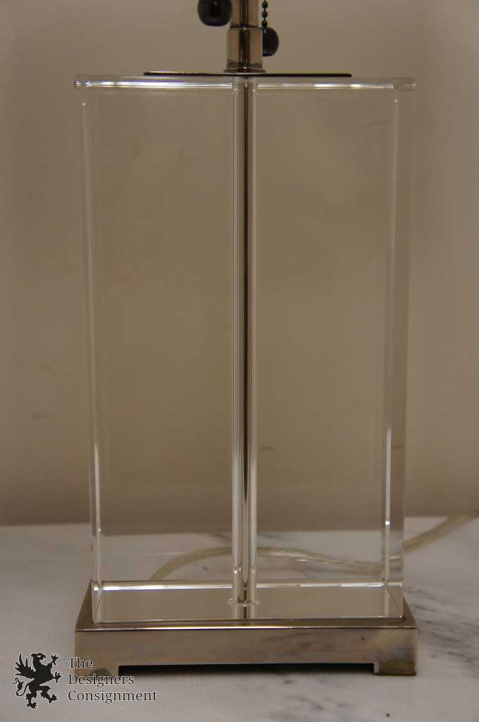 A gorgeous table lamp for any setting. This lamps is not marked, however we are almost certain it is from George Kovaks. Features a sleek modern design with chrome base and heavy glass cuboid center. The lamp features 2 lights with a chrome ball pull switch and off white shade. The perfect addition to any setting.