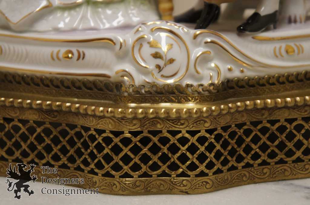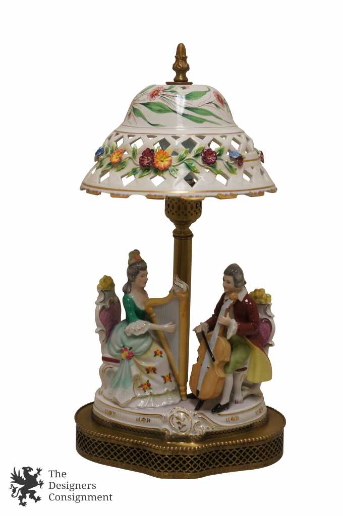 A unique figural table lamp showing 2 musicians in chairs with a pierced floral shade. Sits upon a reticulated brass base. Exquisite color and attention to detail.