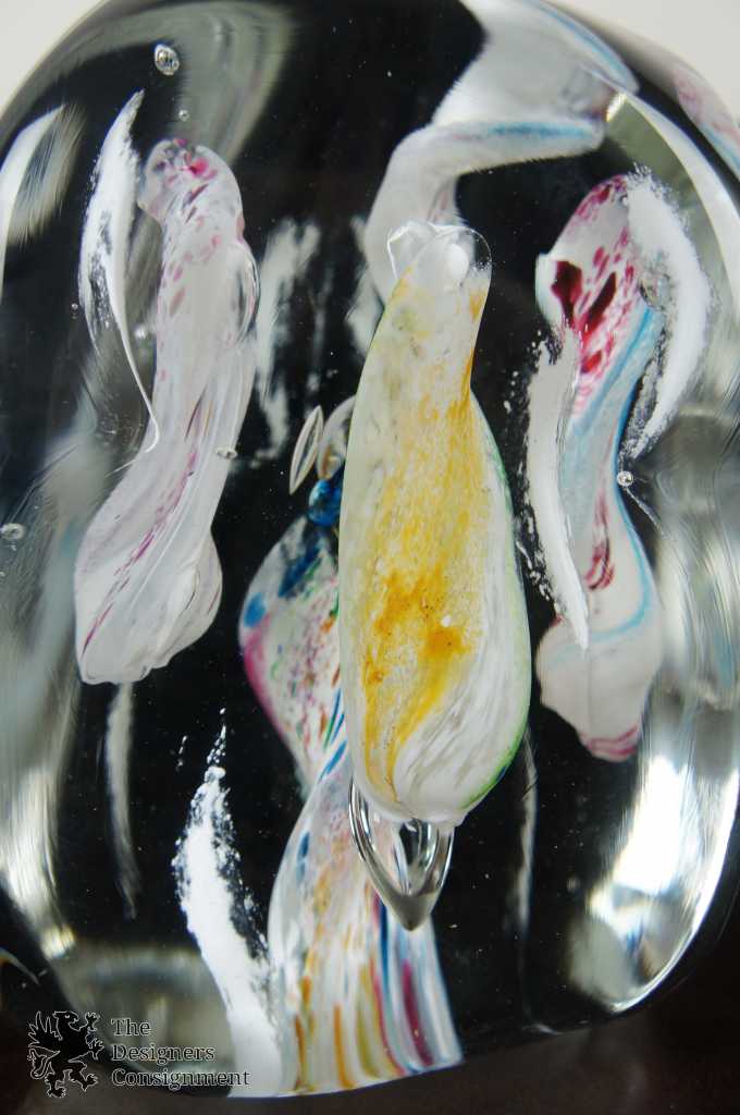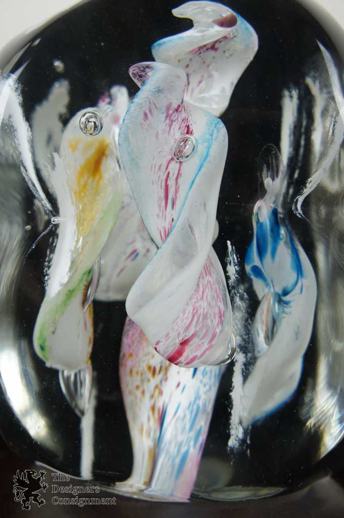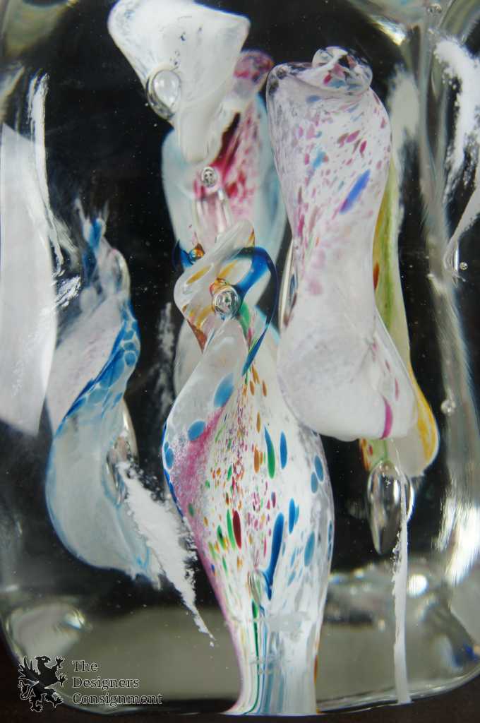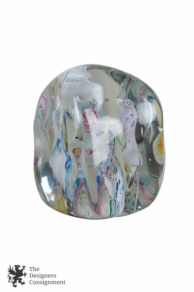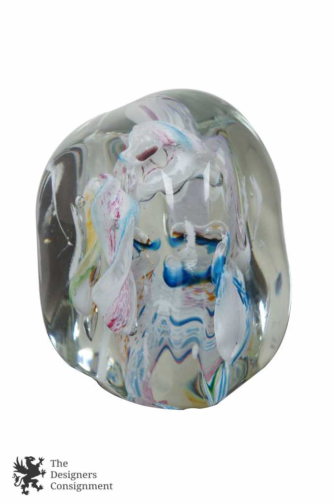 Heavy 7" Signed Art Glass Paperweight Multicolor Suspended Swirls Shapes