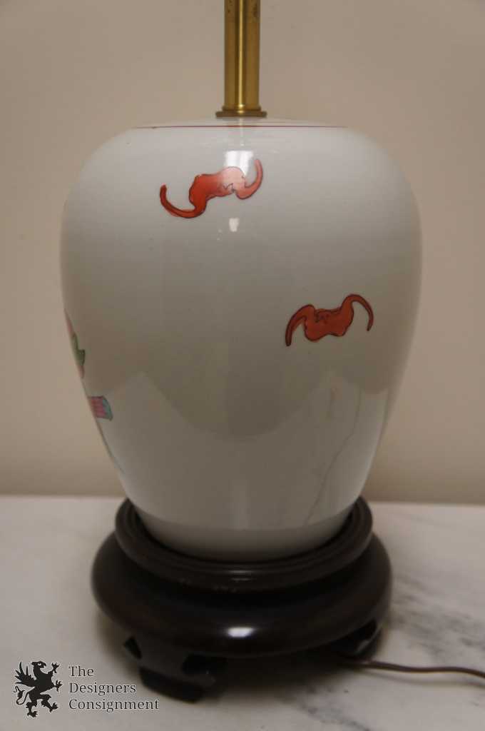 A gorgeous vintage Chinese porcelain ginger jar lamp with traditional Famille Rose/Verte Geisha scene. The lamp features a pleated lamp shade and wooden base.
