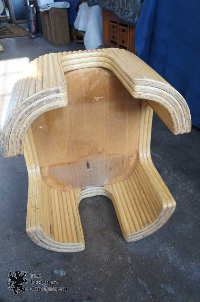 A gorgeous split bamboo table with waterfall corners. Circa 1970s. The top features a geometric design alluding to the expert craftsmanship. A great addition to any setting