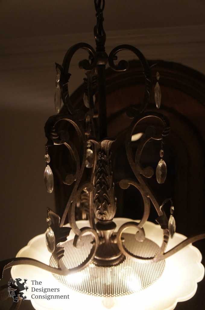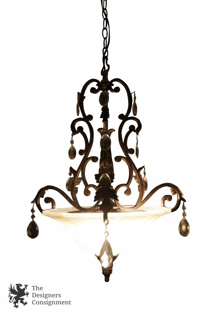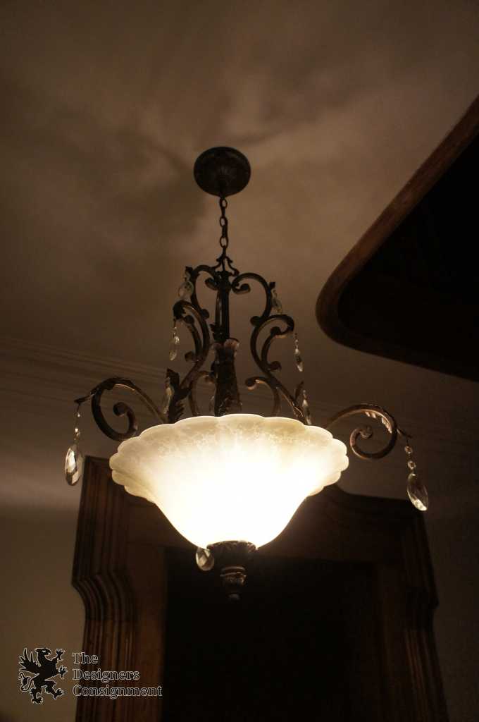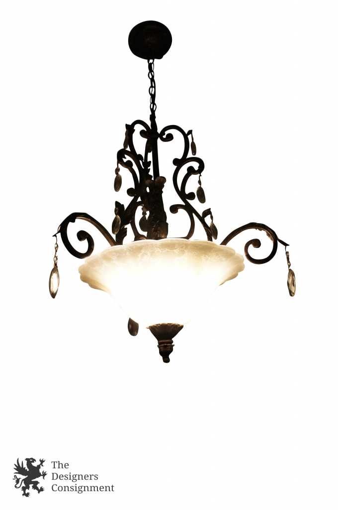A beautifully designed inverted pendant light with frosted globe. Made from Iron with octagonal and Swedish drop crystal prisms. The light is in traditional french styling with acanthus accents. A neat addition to any space.