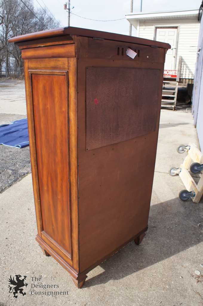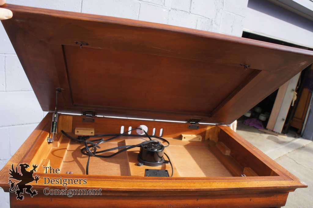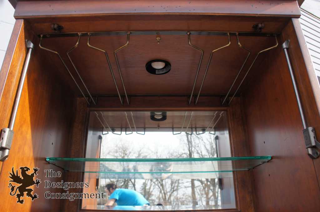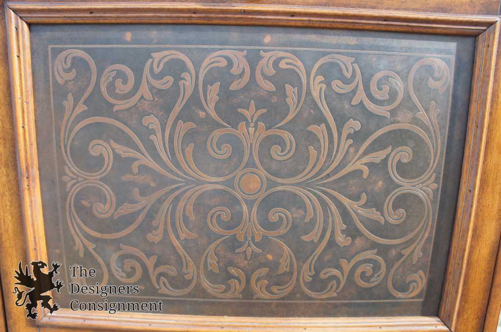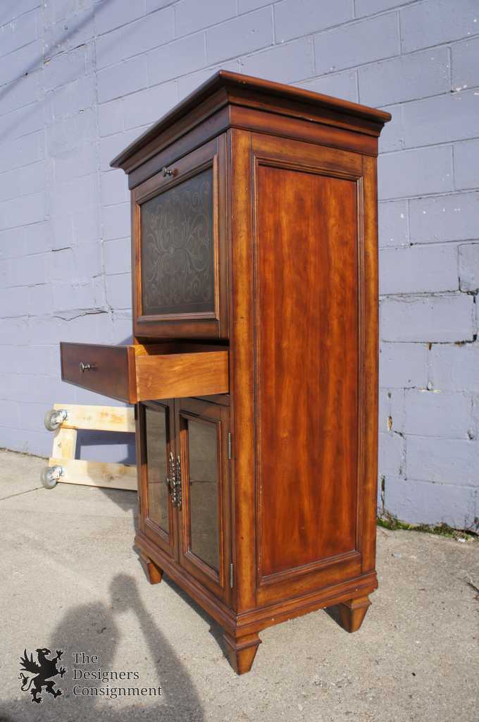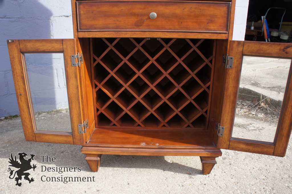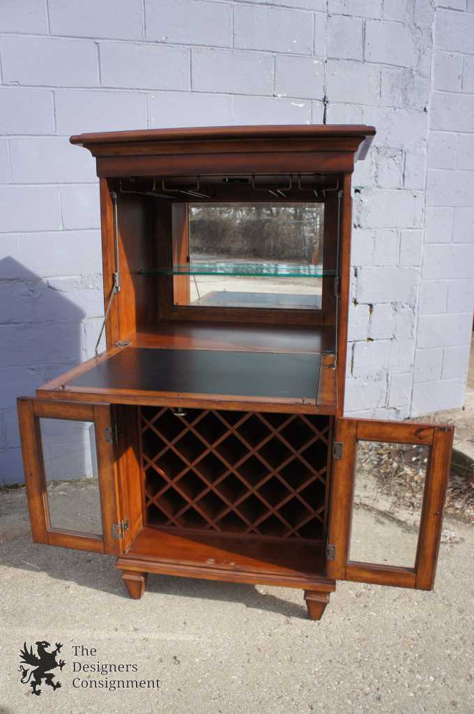 Here we have a traditional flip down dry bar cabinet. Finished in Walnut with distressed accents. Front door panel has a bronzed filigree design. Upper cabinet portion flips opens to an illuminated interior with mirrored backing and shelf. Along the stop are glass hangers. The bottom portion of the cabinet features a glass front. When opened it reveals comfortable storage for up to 25 bottles of wine. In addition there is a drawer at the center and small storage space above the light.
