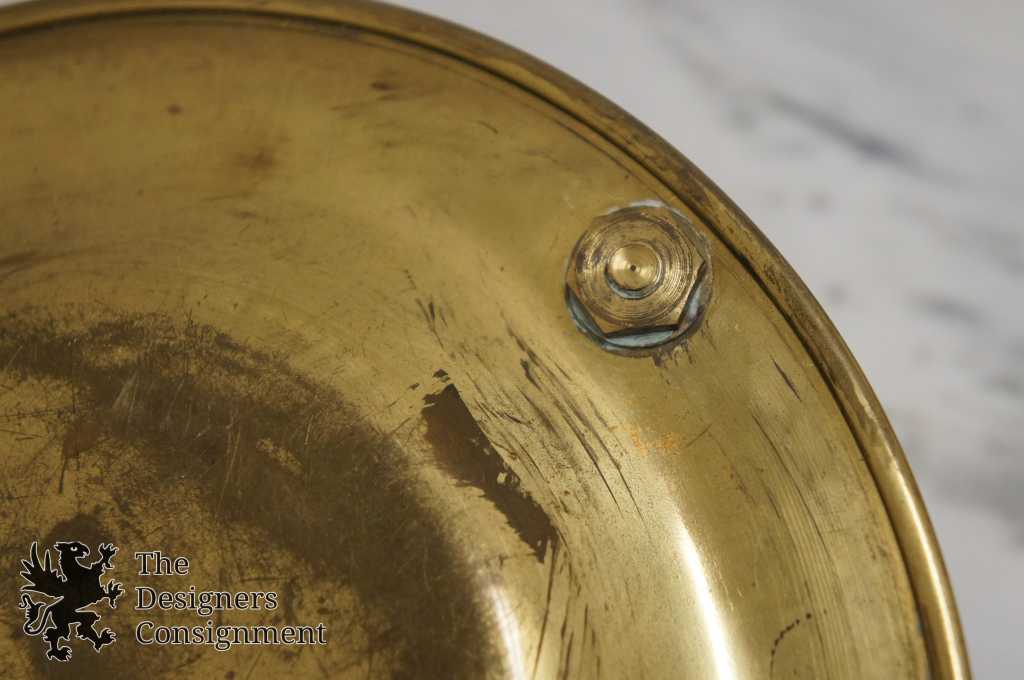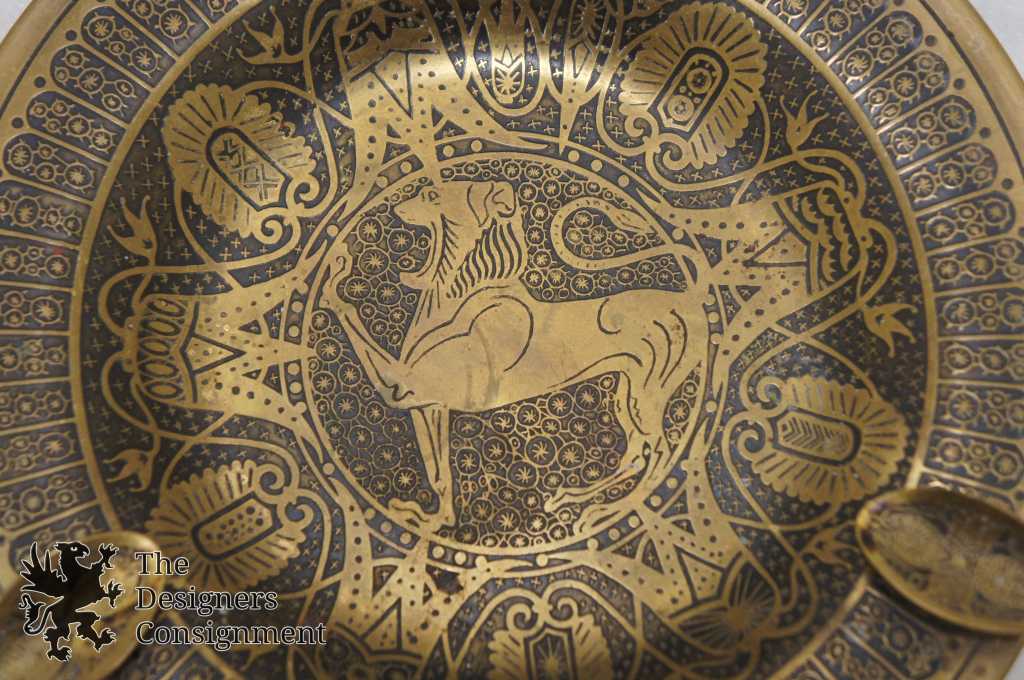 A beautifully designed brass embossed ashtray. Circa 1920-1950s. Egyptian revival with an intricate pattern. Features two rests for cigarettes/cigars and a match striker.