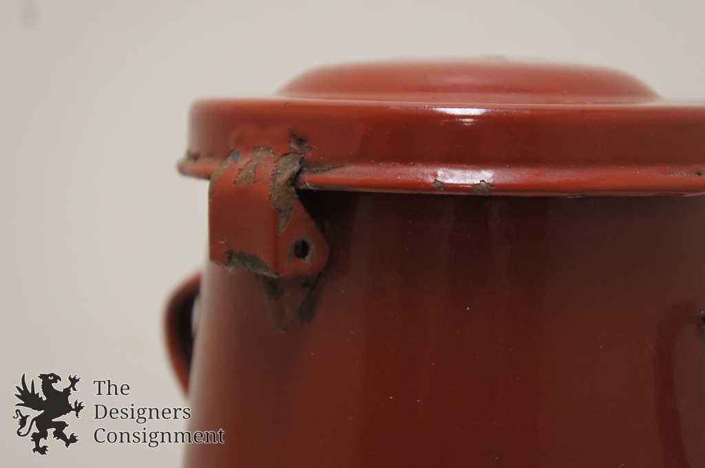 Here we have a neat piece of enamelware. The bottom is marked however part of it has rubbed away, so we are unsure of the maker. Lidded with perforations along the top and handles