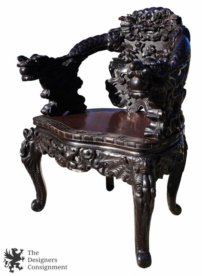 Exquisite early 20th century Chinese arm chair. Made from from Rosewood and elaborately carved in high relief with a figural back, serpentine arms and winged dragon legs. The seat features a Greek Key band. An overall exceptionally detailed piece that will make a wonderful addition to your collection.