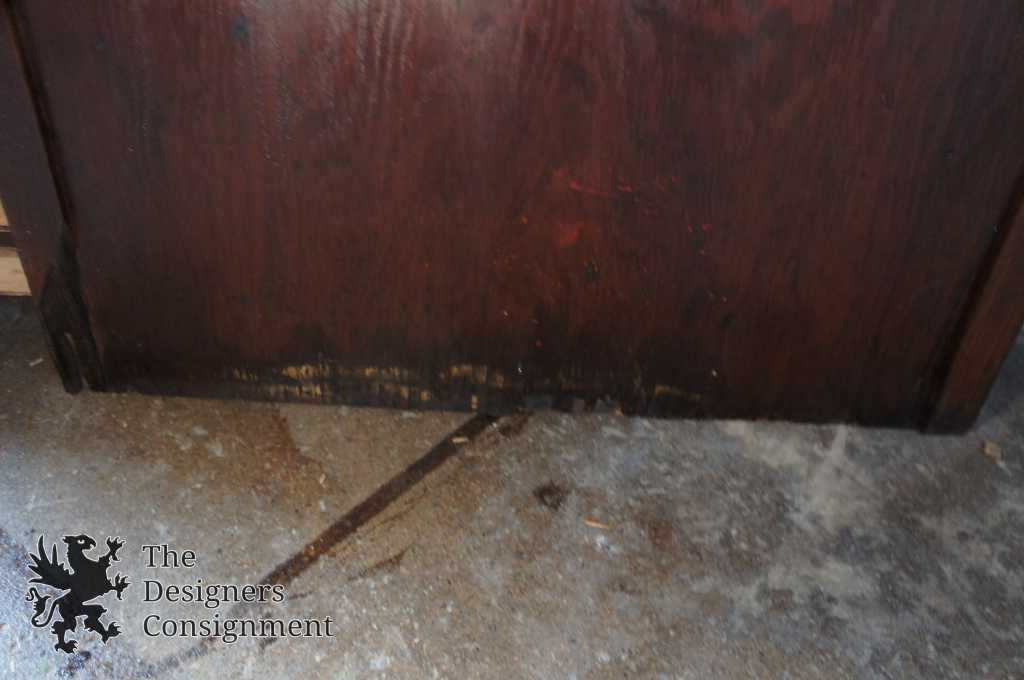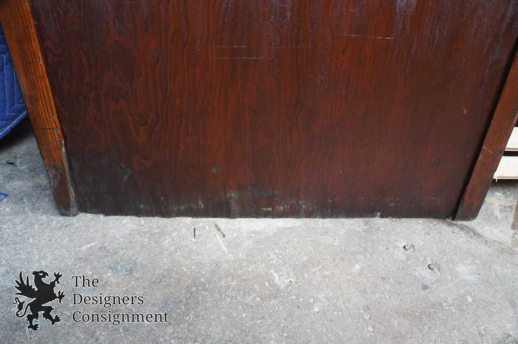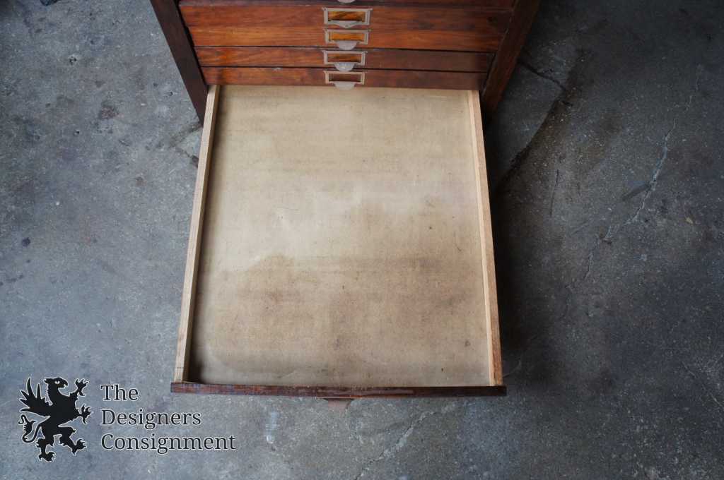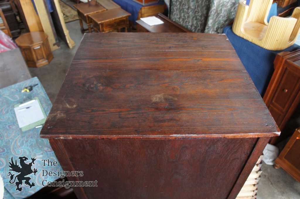 Good overall condition. Some marking and distressing from use. Veneer damage along the bottom edges of the base from being moved around over the years. One of the drawers has different hardware, and another is missing its iron handle portion. In the photos these are seen as the very top and bottom drawers. In addition there is some chipping to the bottom of some of the posts.
