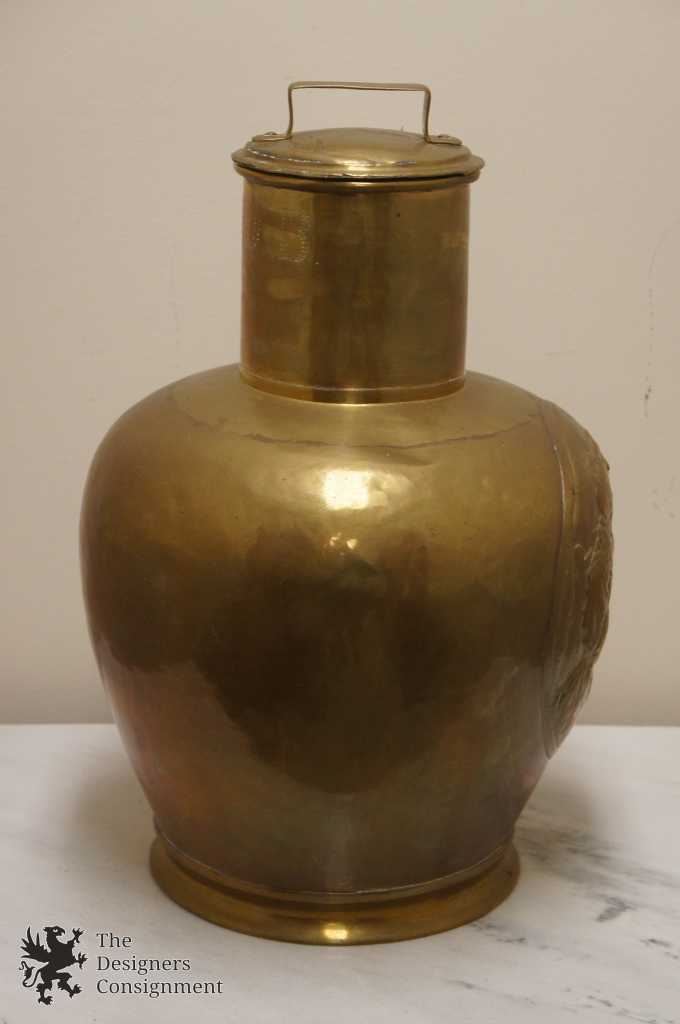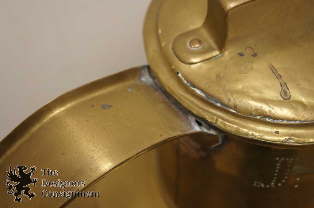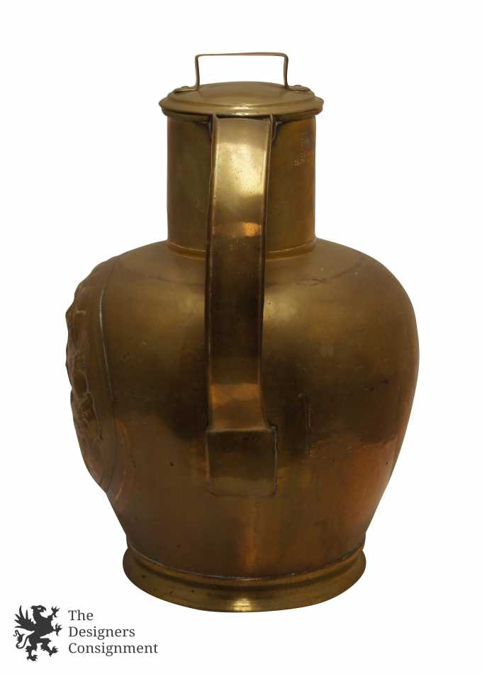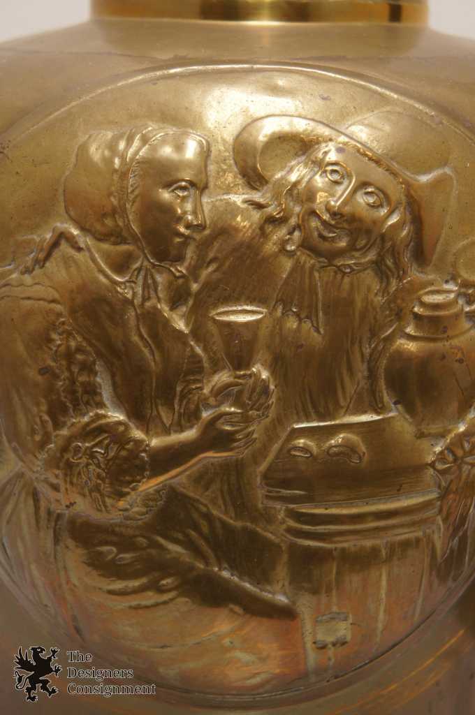 A beautifully designed antique brass jug. Features an embossed brass scene. This piece is stamped along the top J.O.D.B. A great addition to any setting.