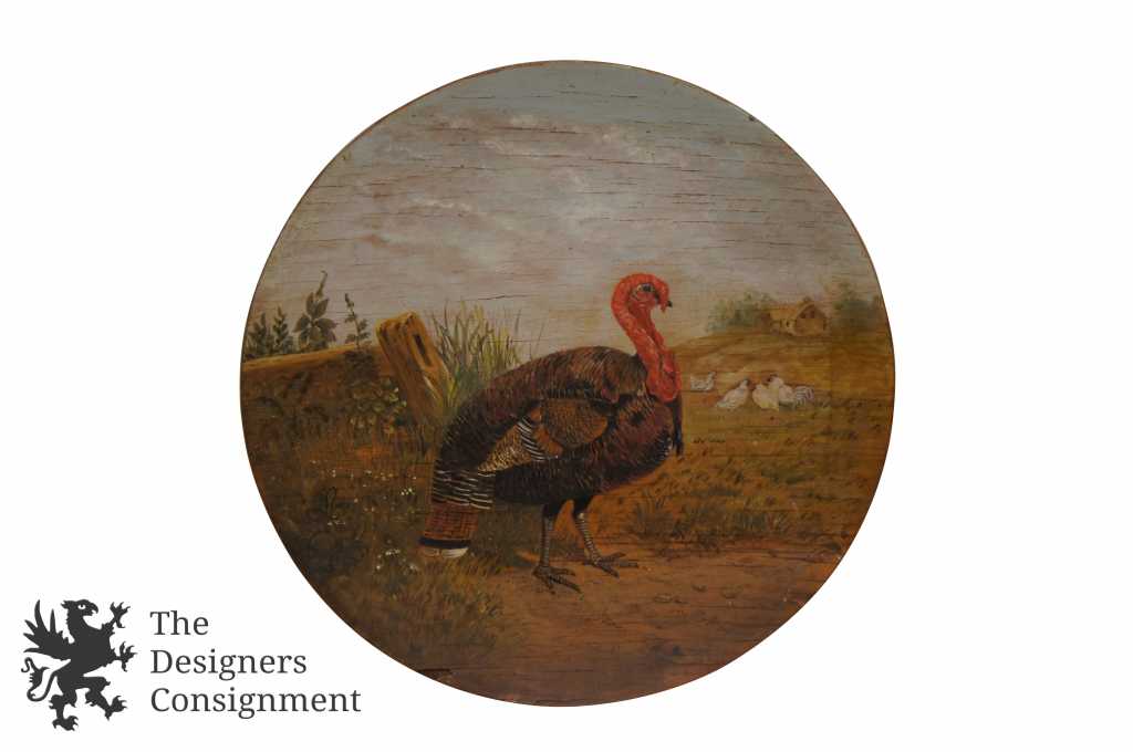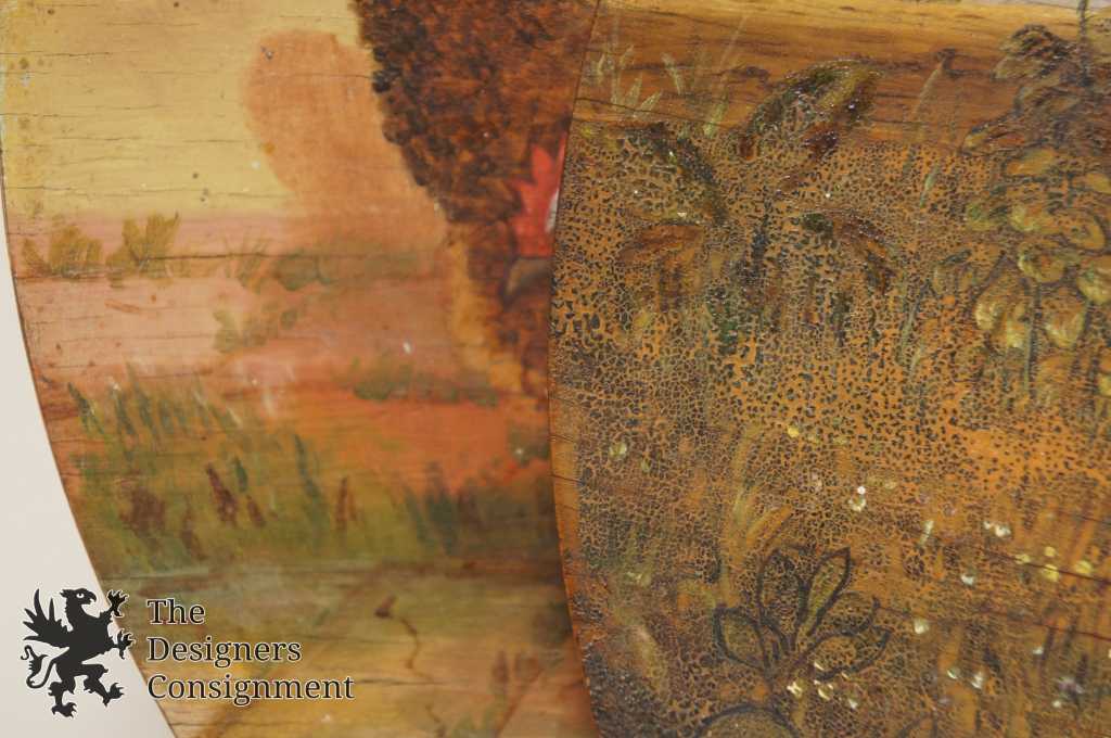 A unique pair of wooden painted folk art plates. One shows 3 roosters, and the other is of a chicken landscape
