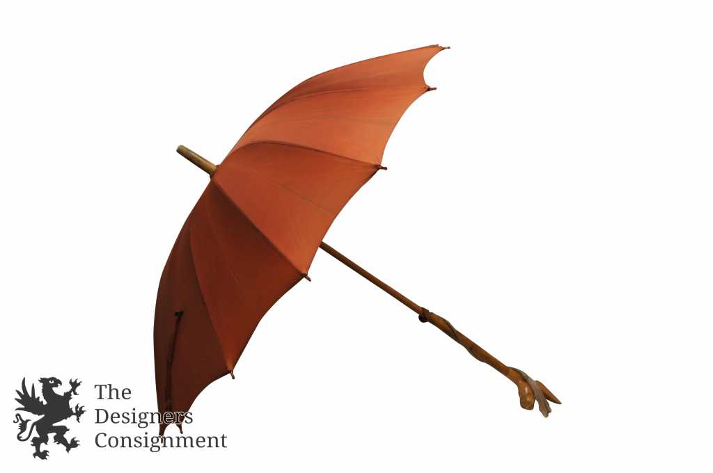 Antique Rust Orange Umbrella with Carved Wood Handle Jack Rabbit Head Parasol