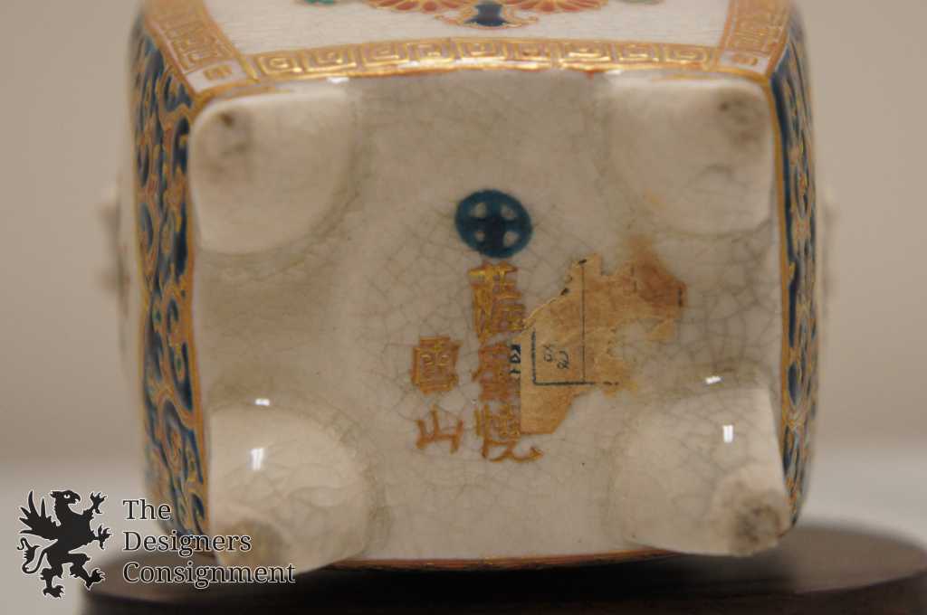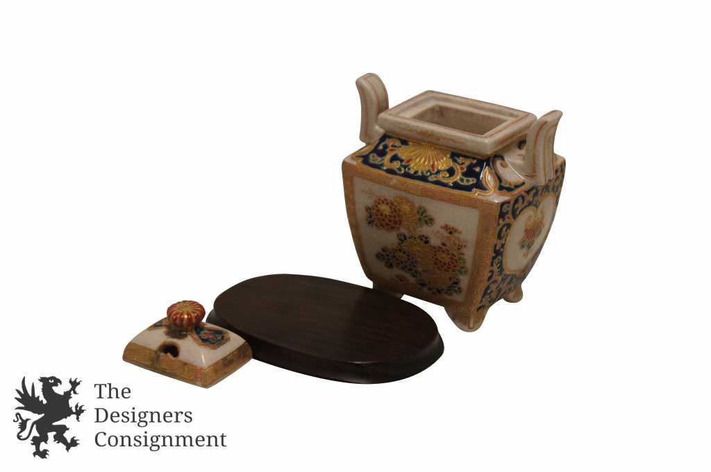 Here we have a unique antique hand painted ceramic censer. Polycrhome with lid and modern wooden base. The piece is signed on the base.