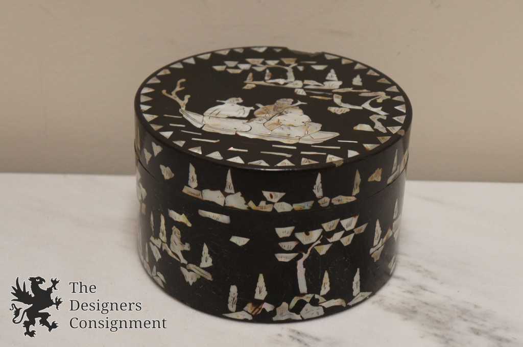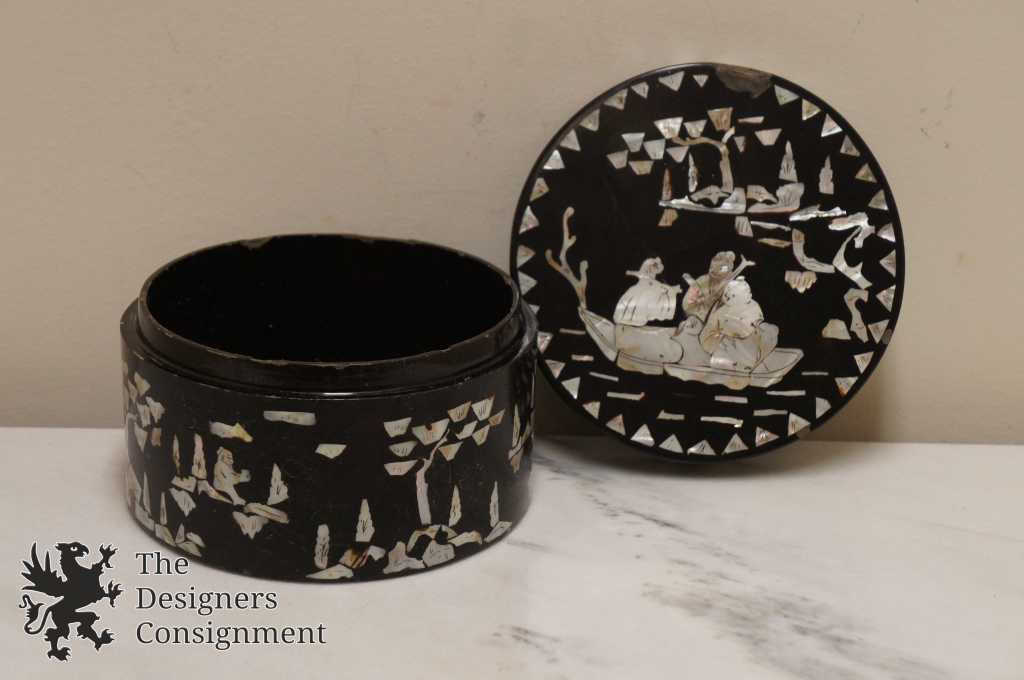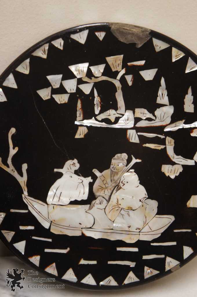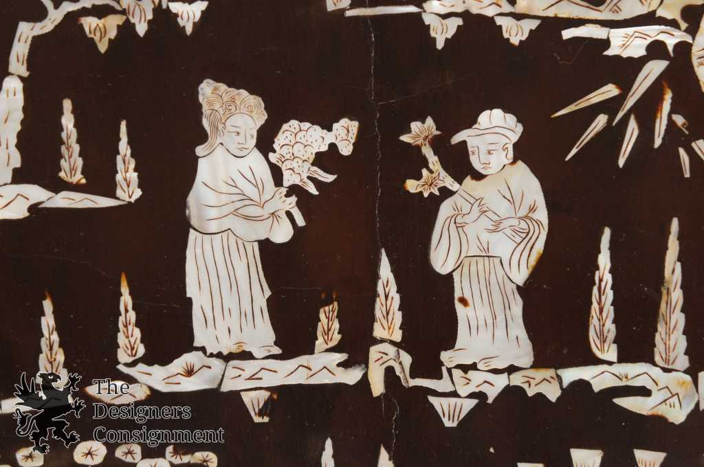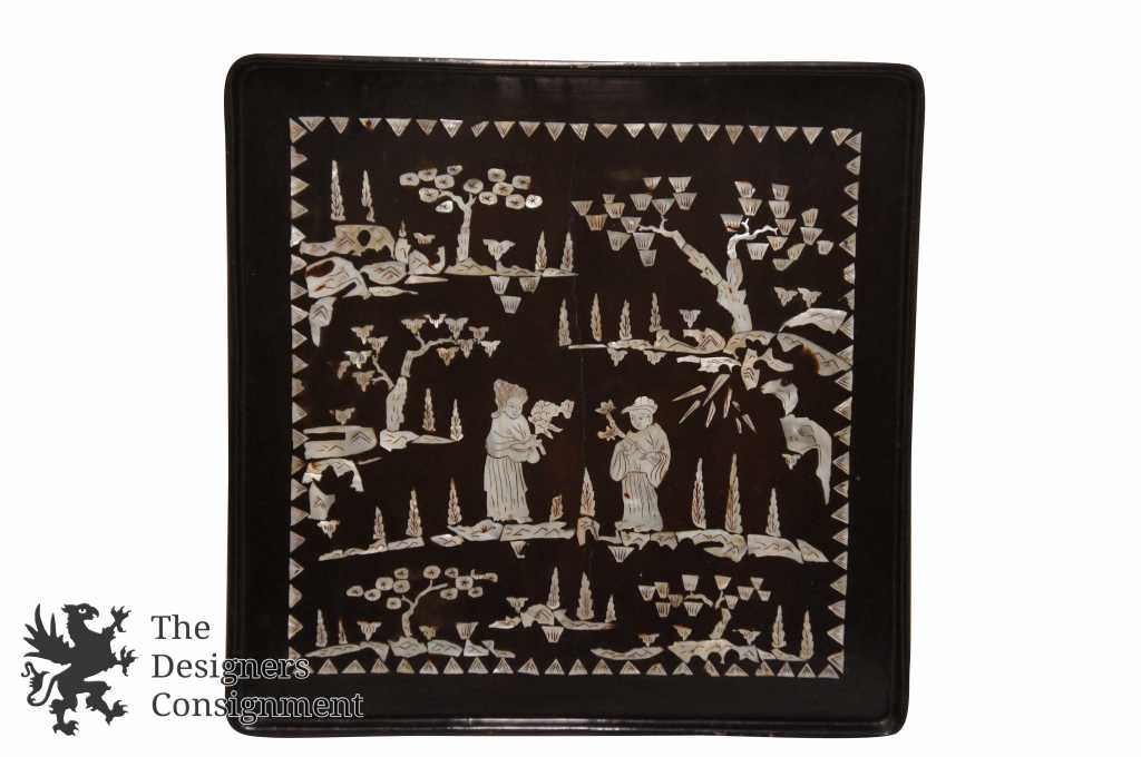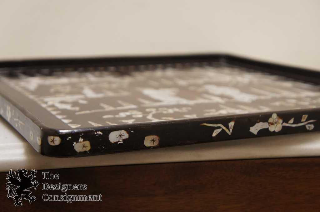 Beautifully designed antique Chinese lacquered mother of pearl tray and box. Each piece is features an intricately detailed scene.