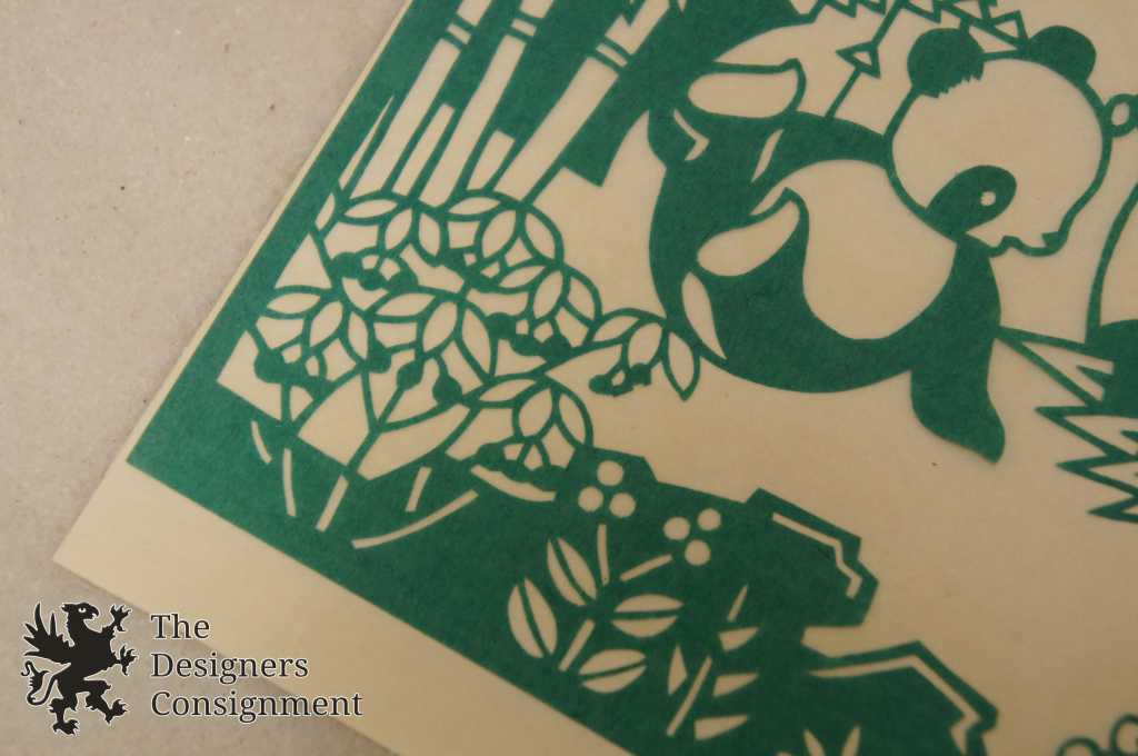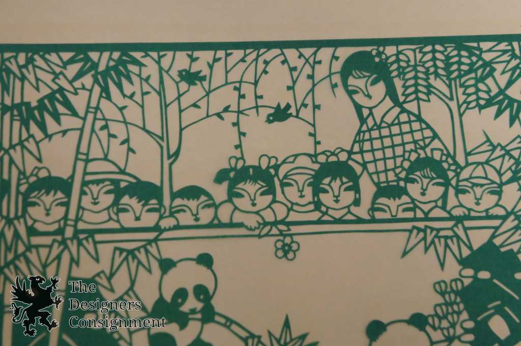 A whimsical Chinese paper cut out showing a zoo scene with pandas eating bamboo while school children watch from above. Comes with a sleeve that is marked.