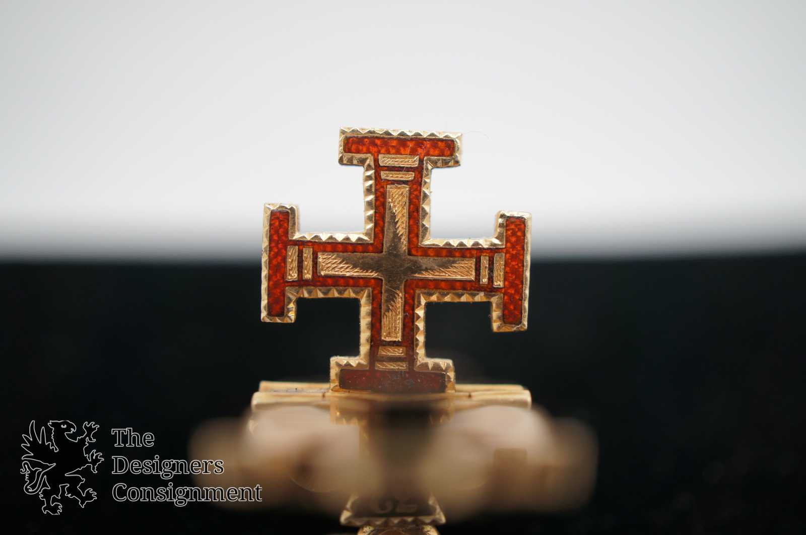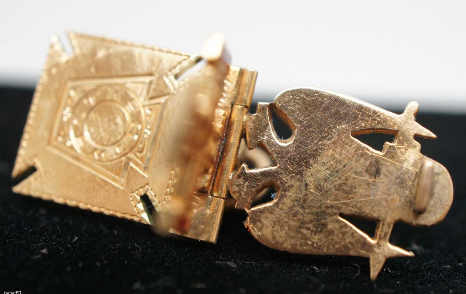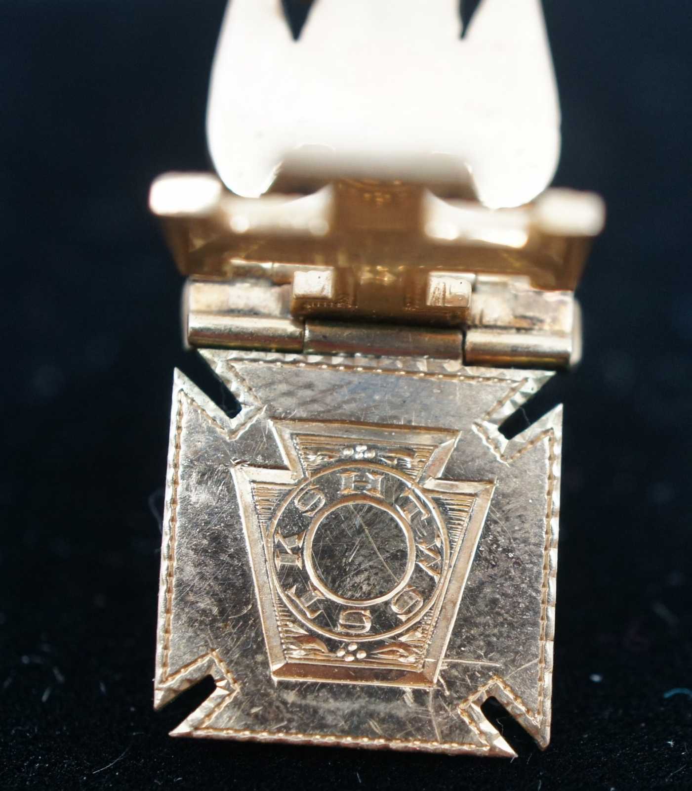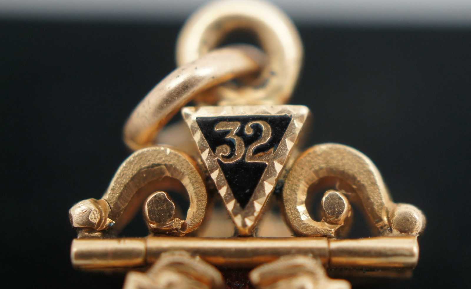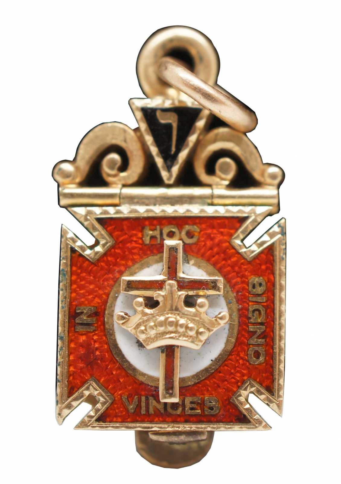 Trifold Masonic fob, charm or pendant. Features scottish rite, a double eagle, a cross and crown in enamel over 10k gold. In HOC Signo Vinces. Freemason.