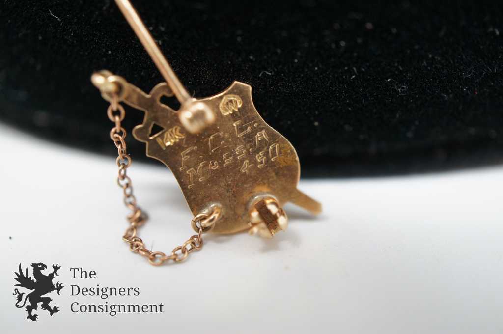 1940s Phi Delta Theta fraternity lapel pin. 14K yellow gold with enameled label and diamond chip.