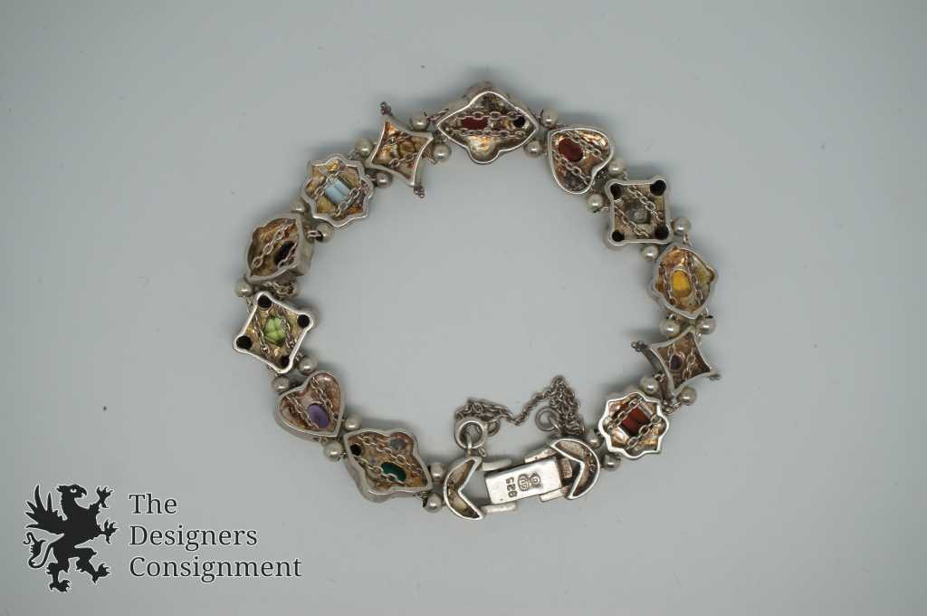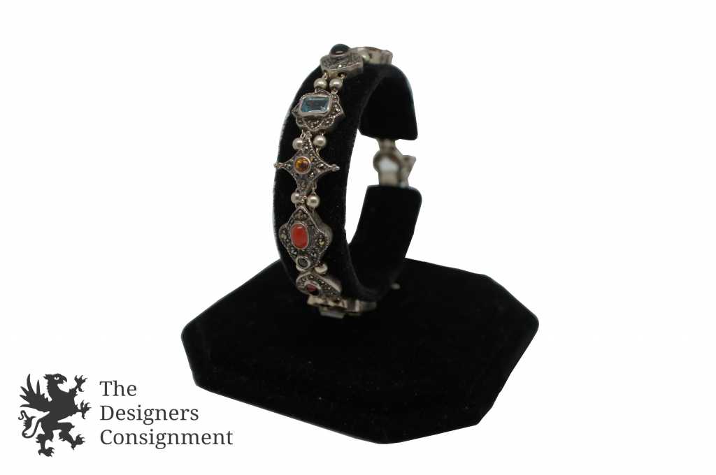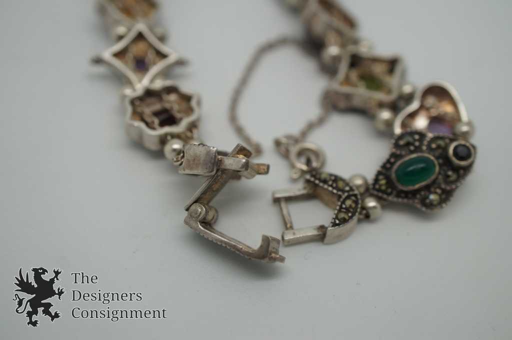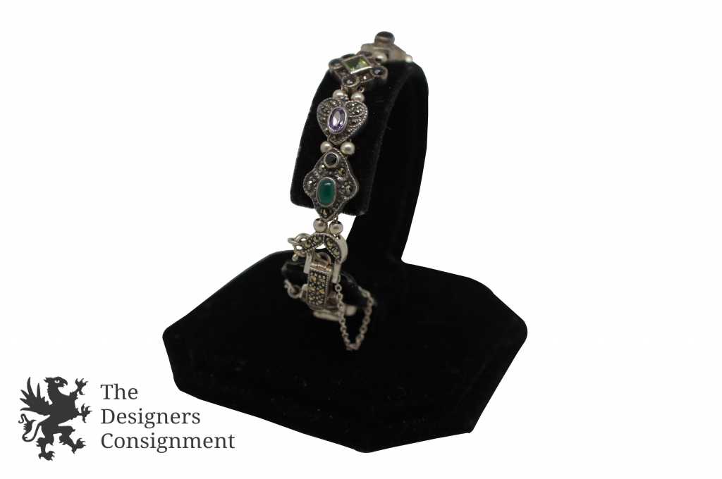 A beautiful art deco style charm bracelet with hematite chips. Band is sterling silver. A neat addition to any collection.
