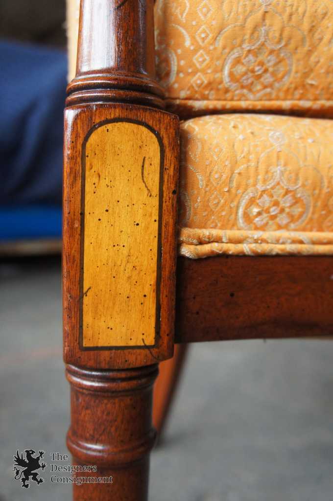 The Hickory Chair Company barrel chair features a cherry wooden frame with maple inlay and an orange patterned cotton upholstery. There is one removable cushion included. The chair sits on two front tapered legs and two back saber legs. The tag under the cushion reads “Hickory Chair Company, Hickory, N.C.”.
