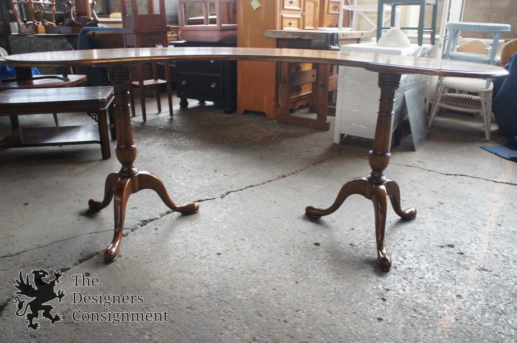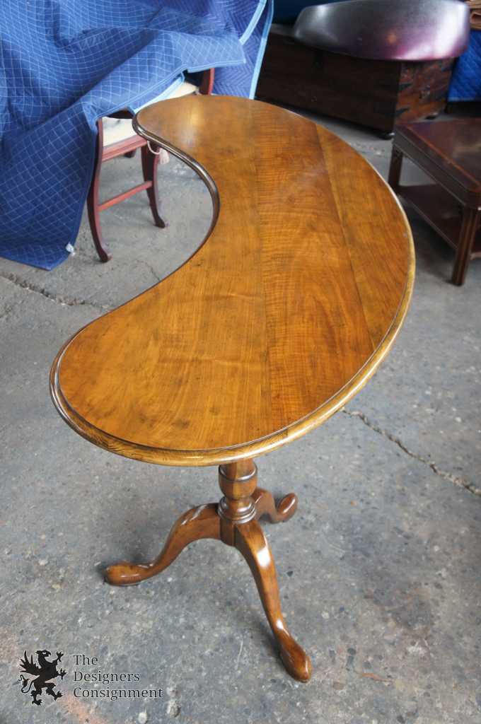 Up for consideration is a gorgeous solid walnut desk by Baker Furniture. Kidney Bean/ Crescent shaped with amazing color and grain pattern. The desk is supported by two Queen Anne pedestals with slipper feet. This relatively lightweight and easy to move around. Could double as a console or serving table.